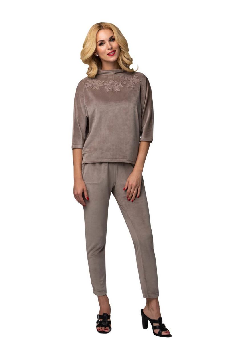 Женский бархатный костюм "Lelio", бежевый, размер M, свитшот с кружевным декором и брюки