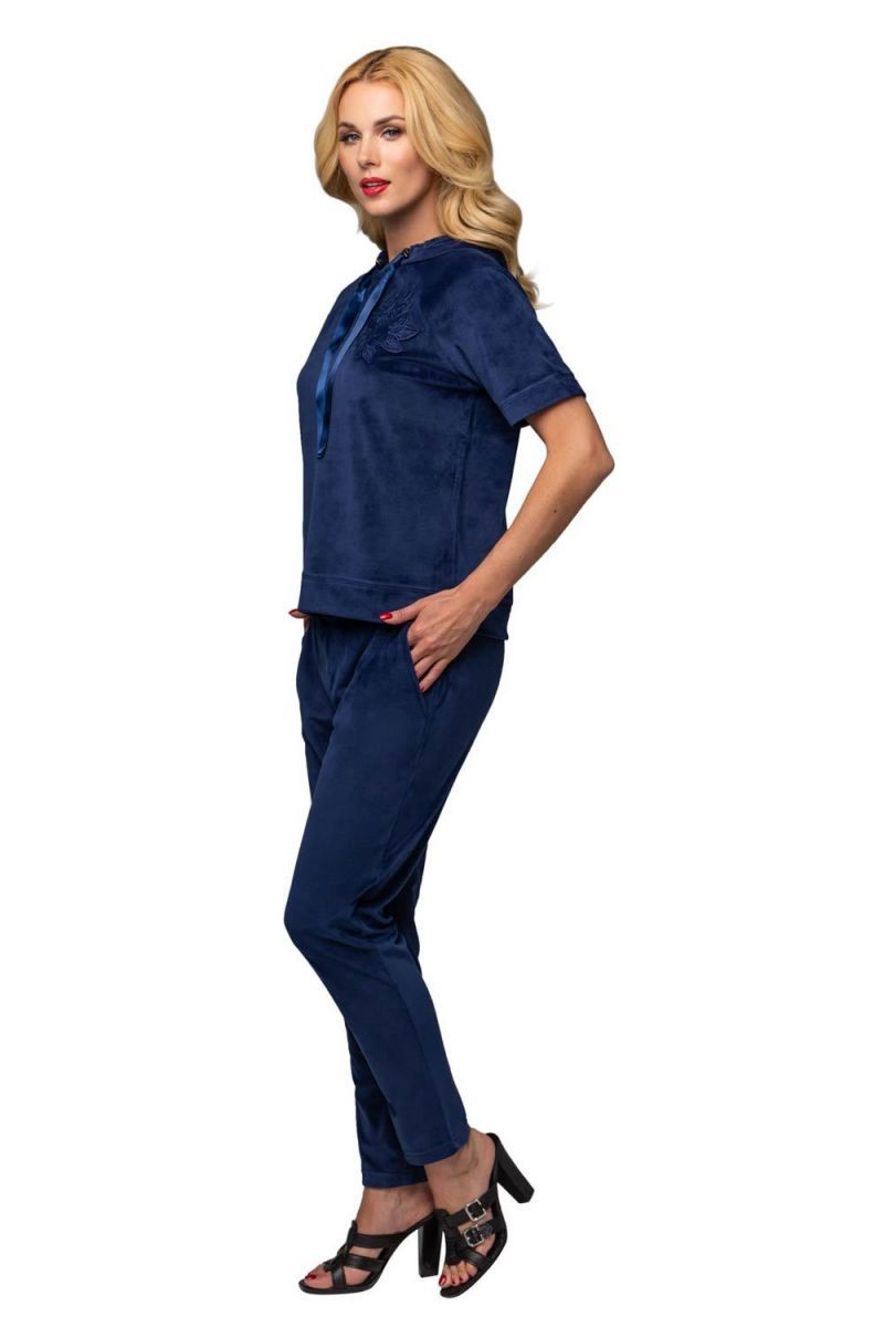 - Стильный внешний вид: Бархатная текстура и кружевная аппликация делают костюм элегантным даже в домашней обстановке.