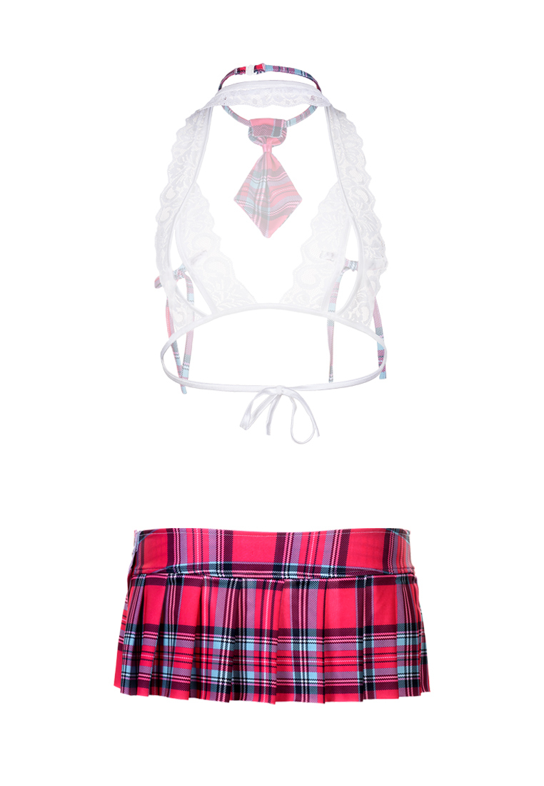 Комплект выполнен из комбинации кружева и полиэстера, что обеспечивает комфорт при длительной носке. Контрастная красно-синяя клетка юбки визуально корректирует силуэт, а полупрозрачные вставки топа добавляют образу игривости.