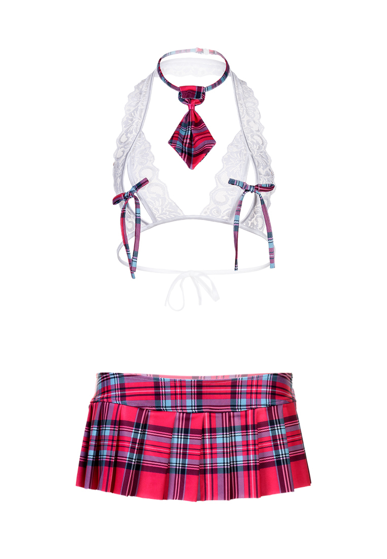 Элегантный комплект для ролевых игр сочетает откровенность и стиль. Кружевной топ с кокетливыми бантиками и мини-юбка в клетку подчеркнут вашу индивидуальность, а галстук добавит завершенности образу.