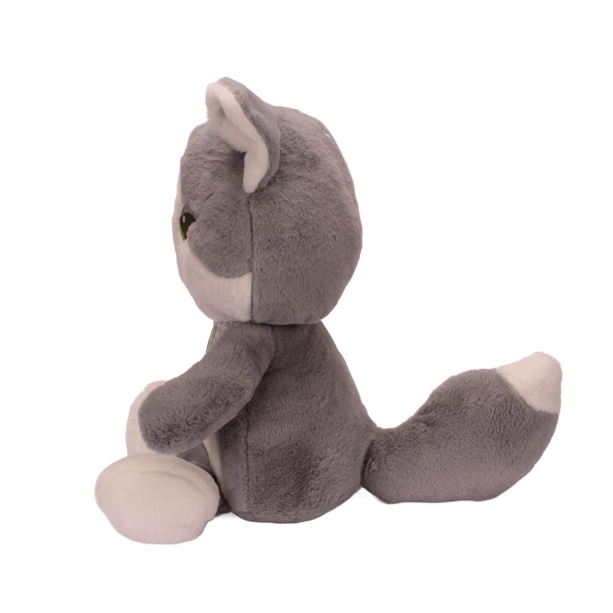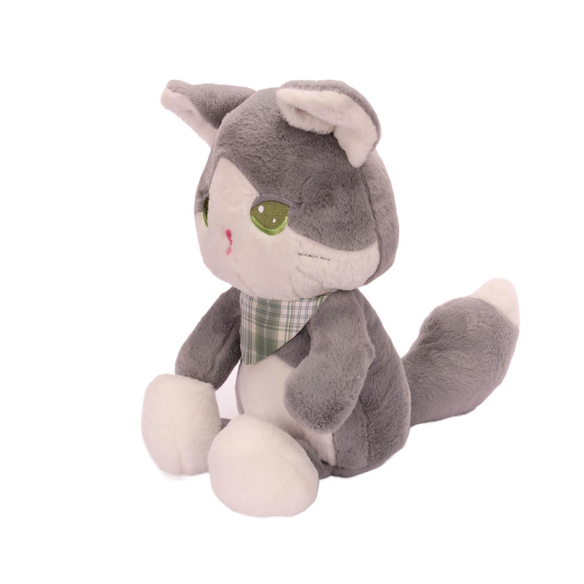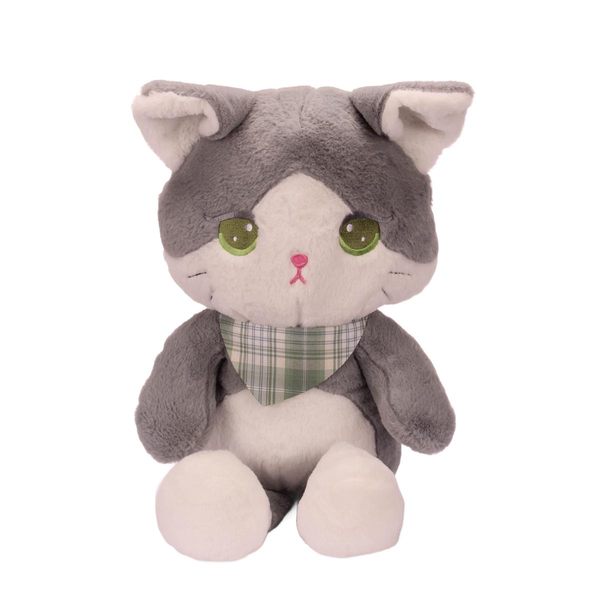 Игрушка выполнена в серо-белом цвете с выразительными зелеными глазами и аккуратной вышивкой мордочки. На шее повязана клетчатая косынка, придающая образу особый шарм. Кот находится в сидячем положении, устойчив и удобен для объятий. Мягконабивная конструкция не содержит элементов питания и механизмов, что делает игрушку безопасной для повседневного использования.