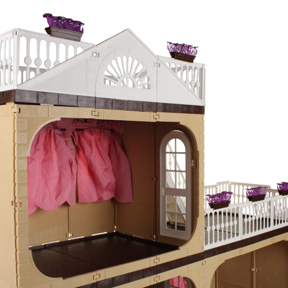 Размеры домика составляют 86 см в ширину, 74 см в глубину и 33 см в высоту, что делает его достаточно просторным для комфортной игры. Коттедж выполнен в светлых тонах с элементами фиолетового, что добавляет ему привлекательности. Обратите внимание, что мебель в набор не входит, но вы можете дополнить интерьер по своему усмотрению.