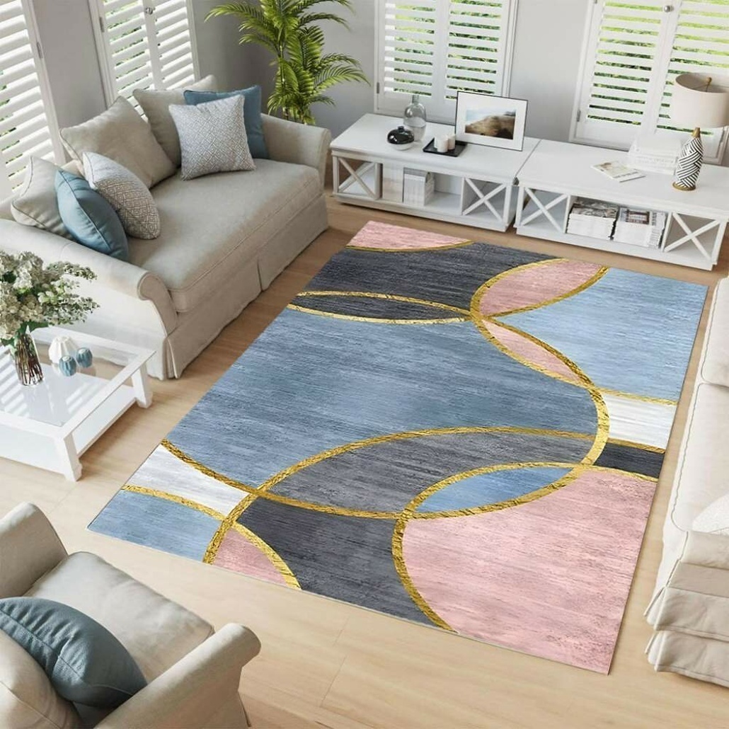 Ковер представлен в модной пастельной гамме с розовыми оттенками и дополнен стильным геометрическим узором из золотистых и голубых линий, что делает его универсальным решением для современного интерьера.