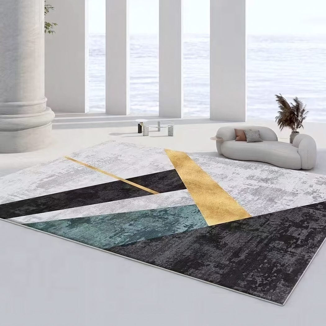 Геометрический узор и нейтральная цветовая гамма создают элегантный акцент в современном интерьере. Износостойкая поверхность с эффектом «потертости» сочетает эстетику лофта с функциональностью — идеально подходит для активного использования в жилых помещениях.