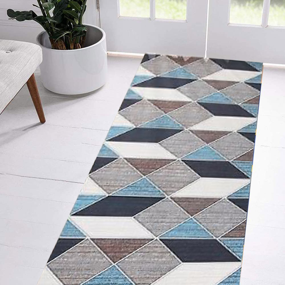 Коврик представлен в серых, синих и коричневых оттенках, что позволяет легко вписать его в любой интерьер. Его геометрический узор добавляет динамики и современности, а текстурированная поверхность придаёт ощущение уюта. Не упустите возможность преобразить ваше пространство с этим стильным ковриком!