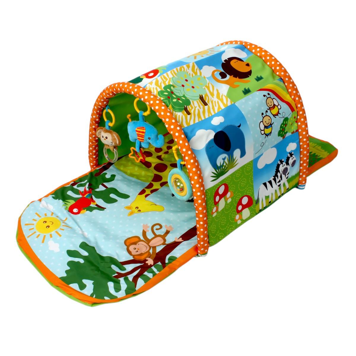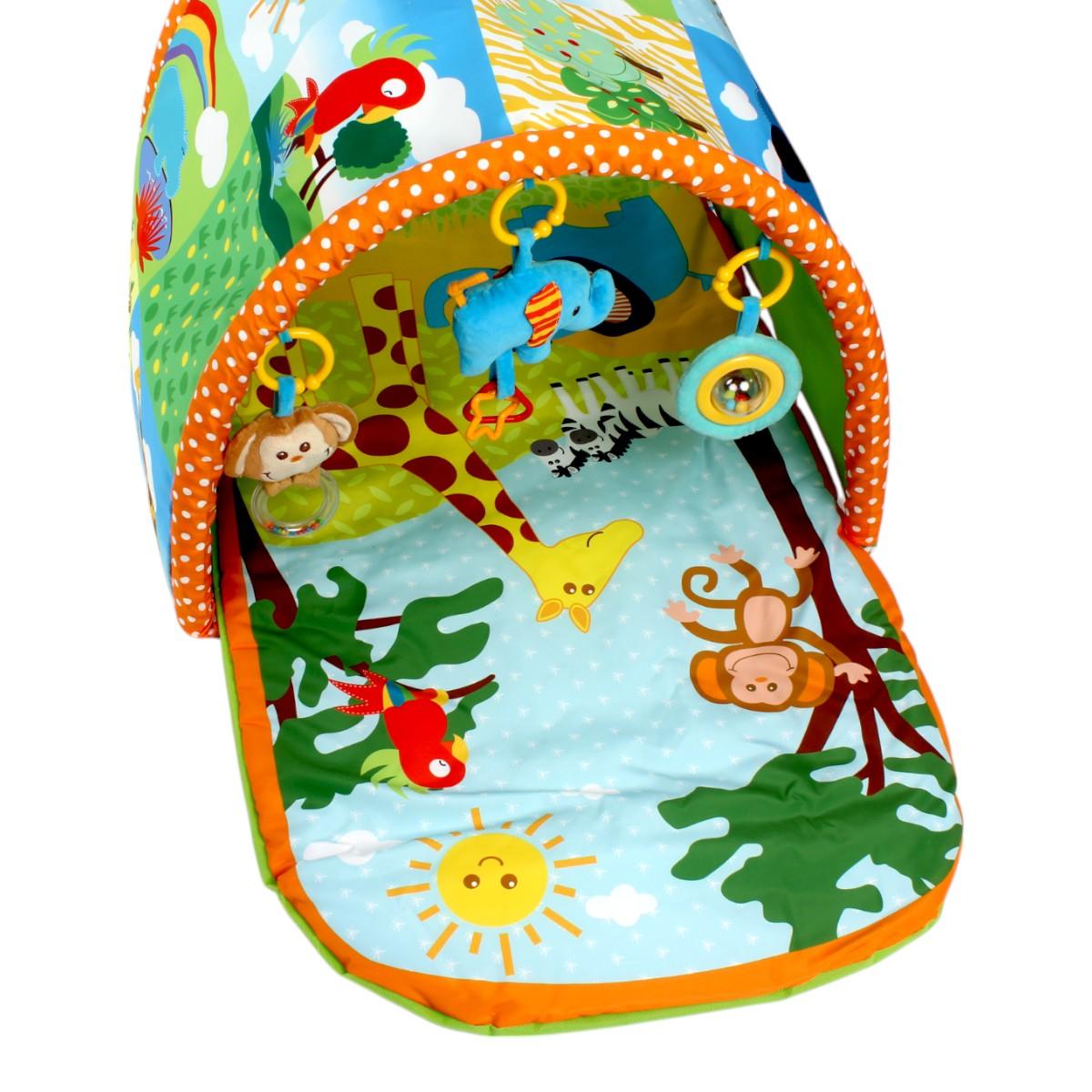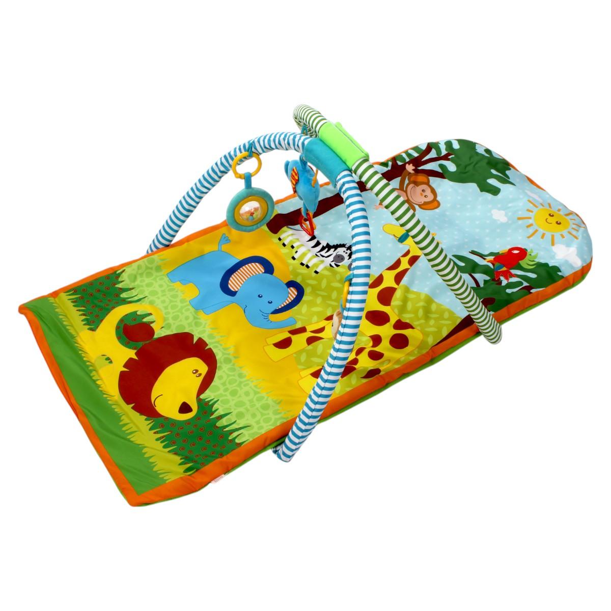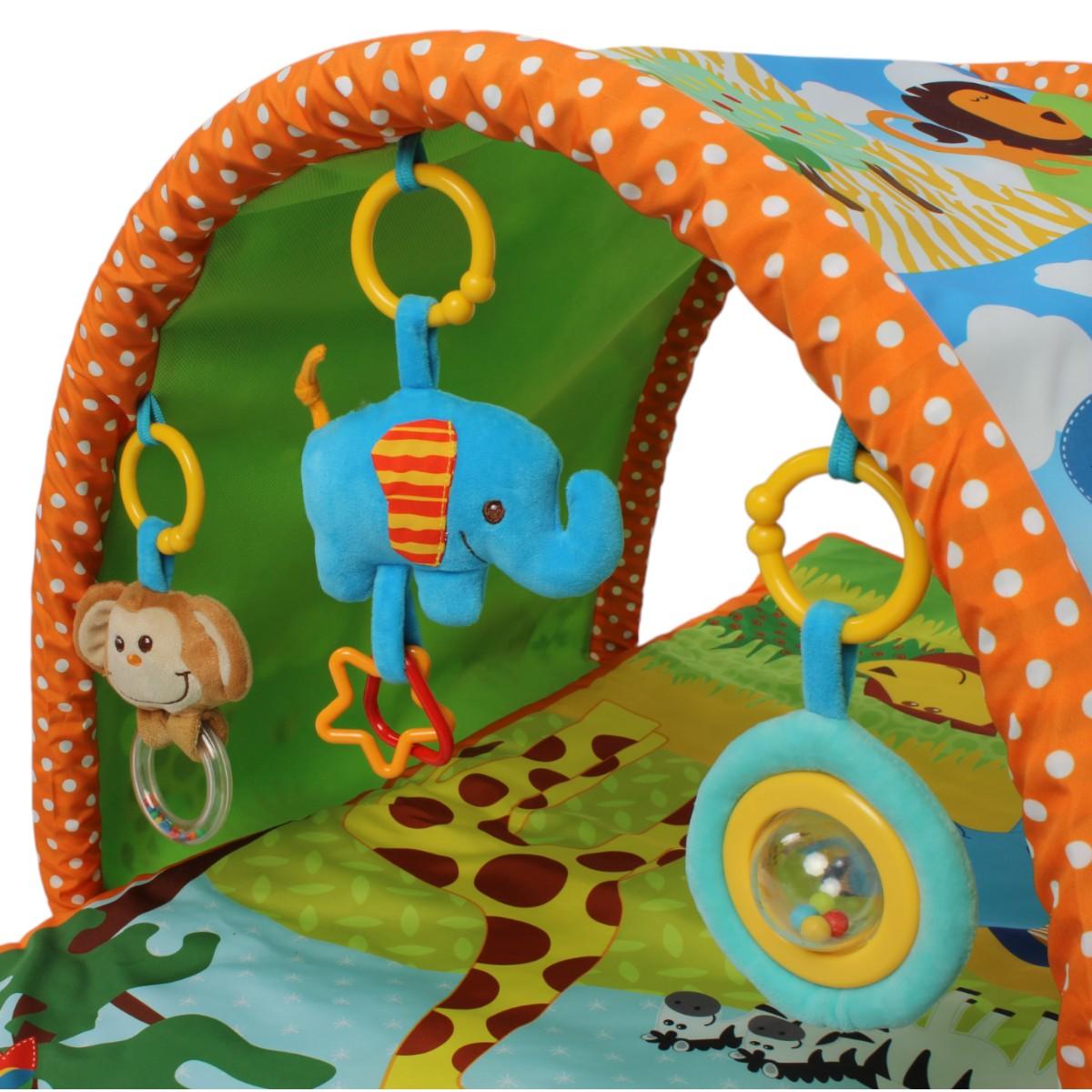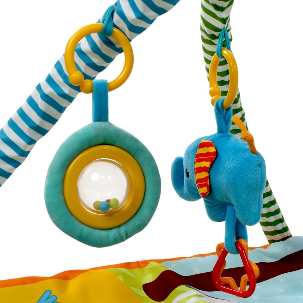 В комплекте: основной коврик с игровым полем, съемная арка с тремя подвесными игрушками.