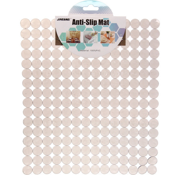 Коврик выполнен из прозрачного ПВХ, что позволяет ему гармонично вписываться в любой интерьер. Его форма с маленькими полукруглыми выступами не только эстетична, но и функциональна, обеспечивая отличное сцепление с поверхностью. Благодаря своим компактным размерам, коврик легко хранить и переносить.