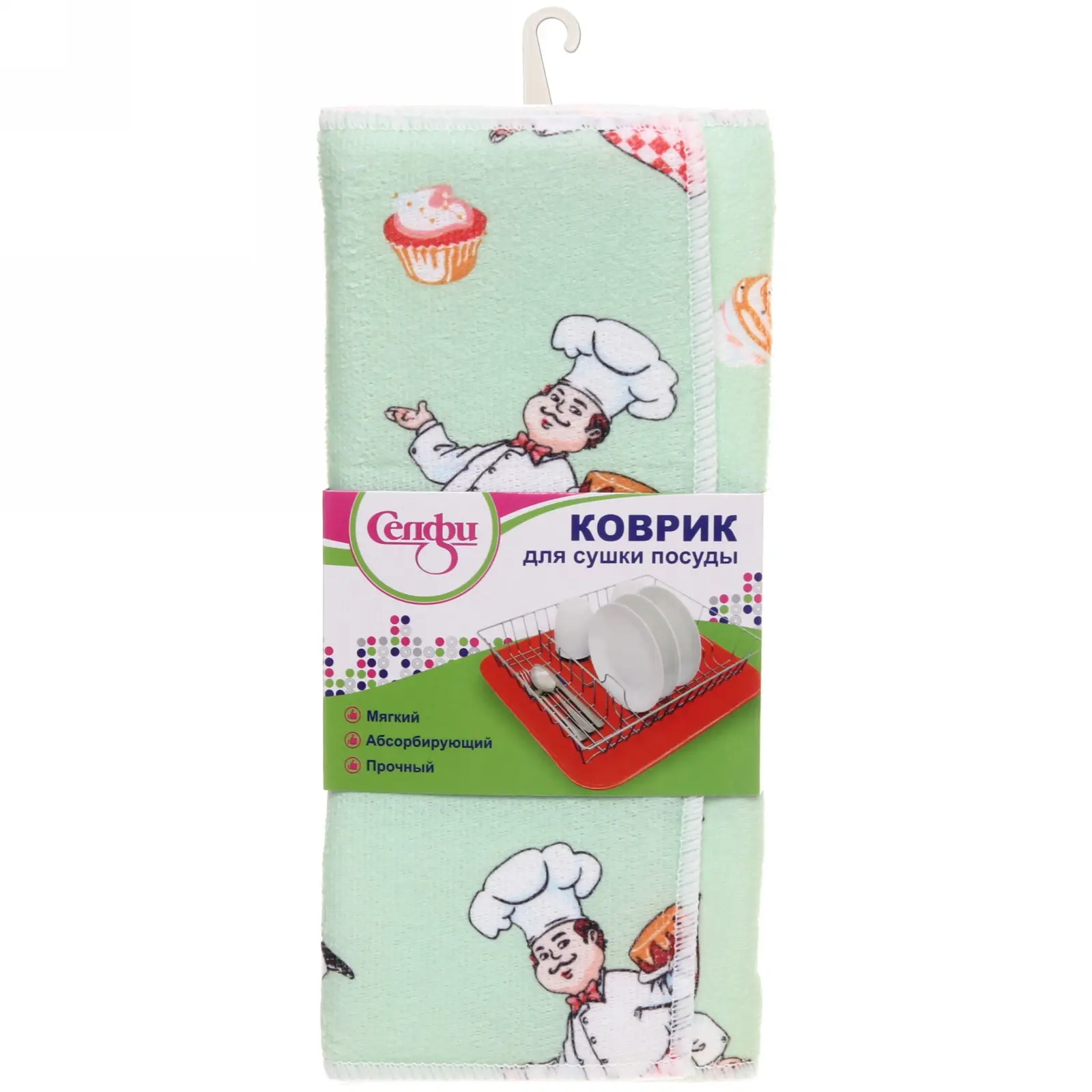 Размер 30х38 см идеально подходит для стандартных раковин. Состав: 90% полиэстер (верхний слой), 10% поролон (наполнитель). Мятный фон гармонично сочетается с любым интерьером, а мультяшные повара добавят игривости в ежедневные дела. Легкая чистка — просто прополощите под проточной водой и высушите на горизонтальной поверхности.