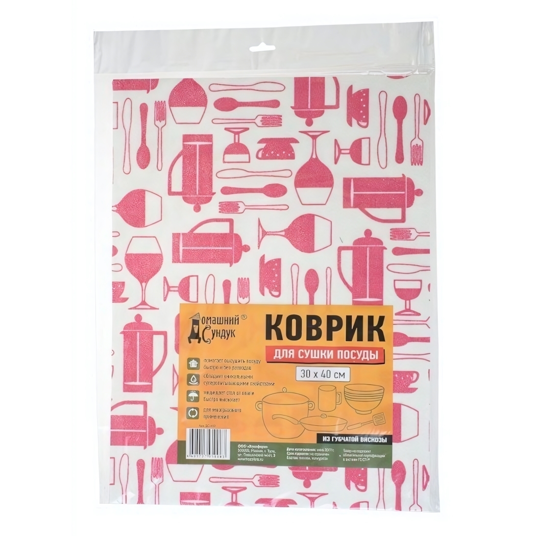 Размер коврика — 30х40 см, что делает его универсальным для большинства кухонных поверхностей. Материал — губчатая вискоза, мягкое и приятное на ощупь покрытие. Цвет: белый с нежным розовым рисунком, который создает уютную атмосферу.