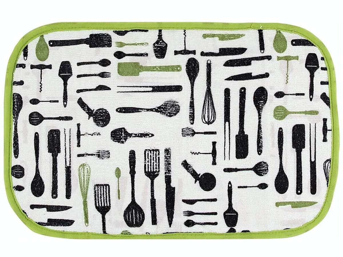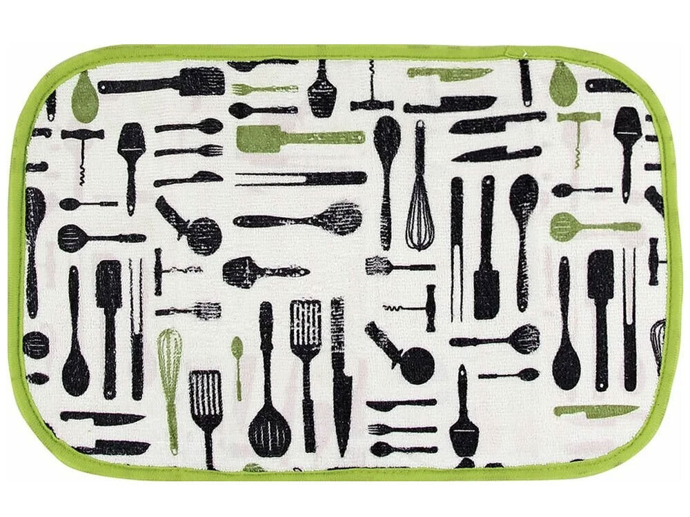 Изделие изготовлено из качественной микрофибры, размером 40×25 см, с прочной окраской, устойчивой к стирке. В комплект входит два коврика разного цвета — светло-зеленый и белый с рисунком. Идеально подходит для использования дома, в дачном доме или на кухне.
