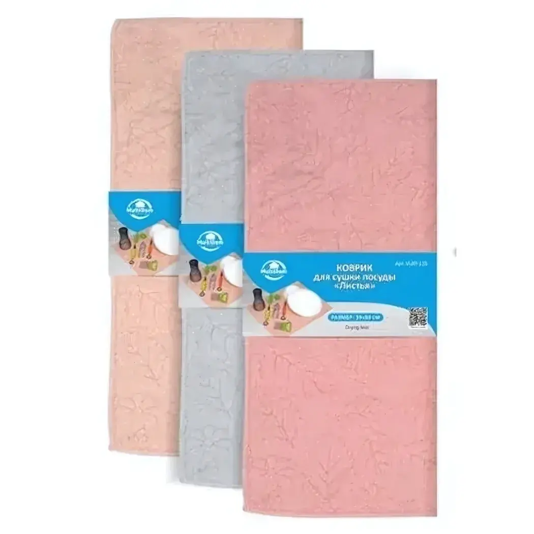 Коврик для сушки посуды с оригинальным фактурным узором 'Листья' создан для быстрого и гигиеничного высыхания кухонной утвари. Мягкая тканевая поверхность бережно впитывает влагу, а компактный размер 39 см идеально вписывается в пространство возле раковины.