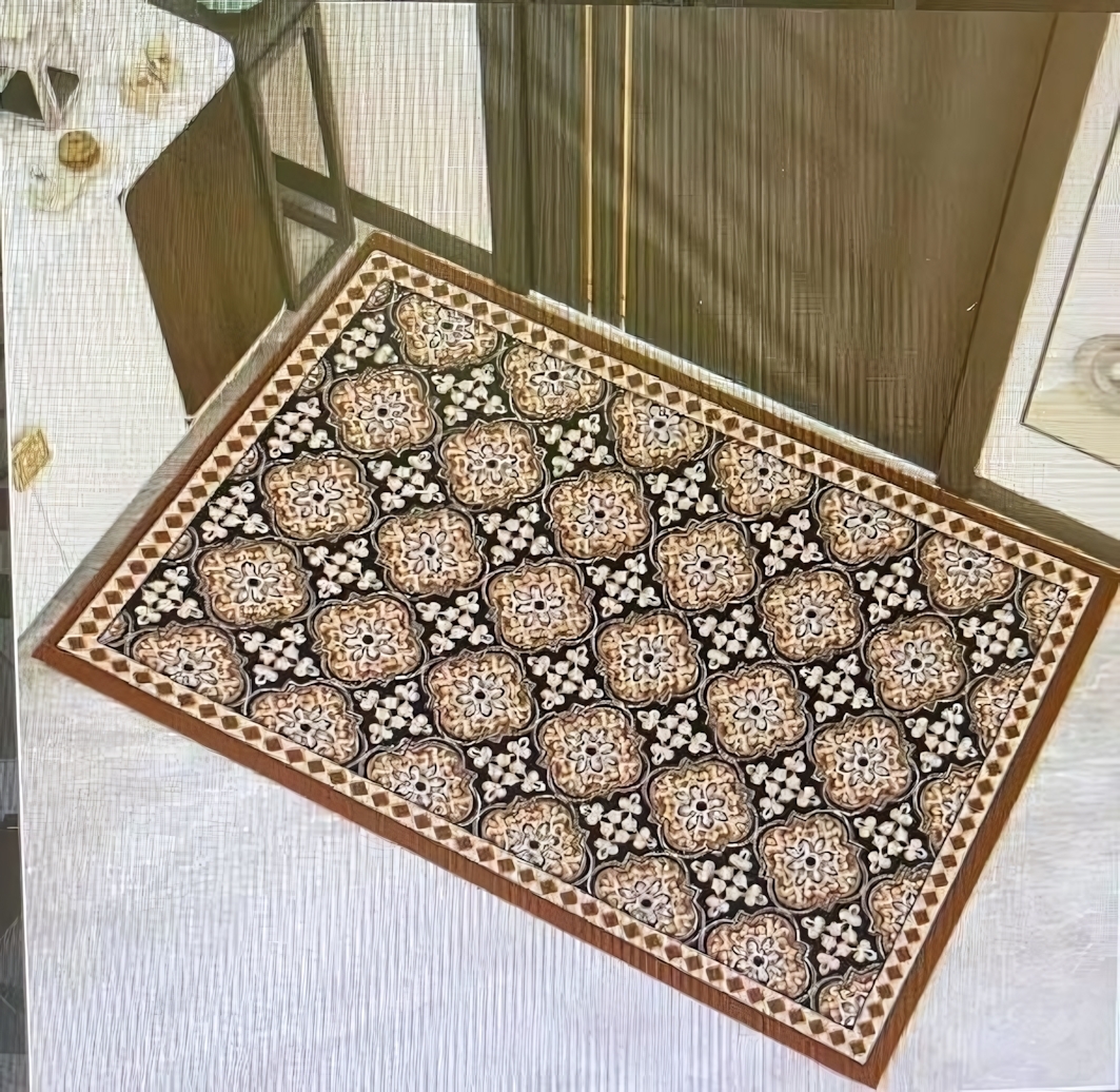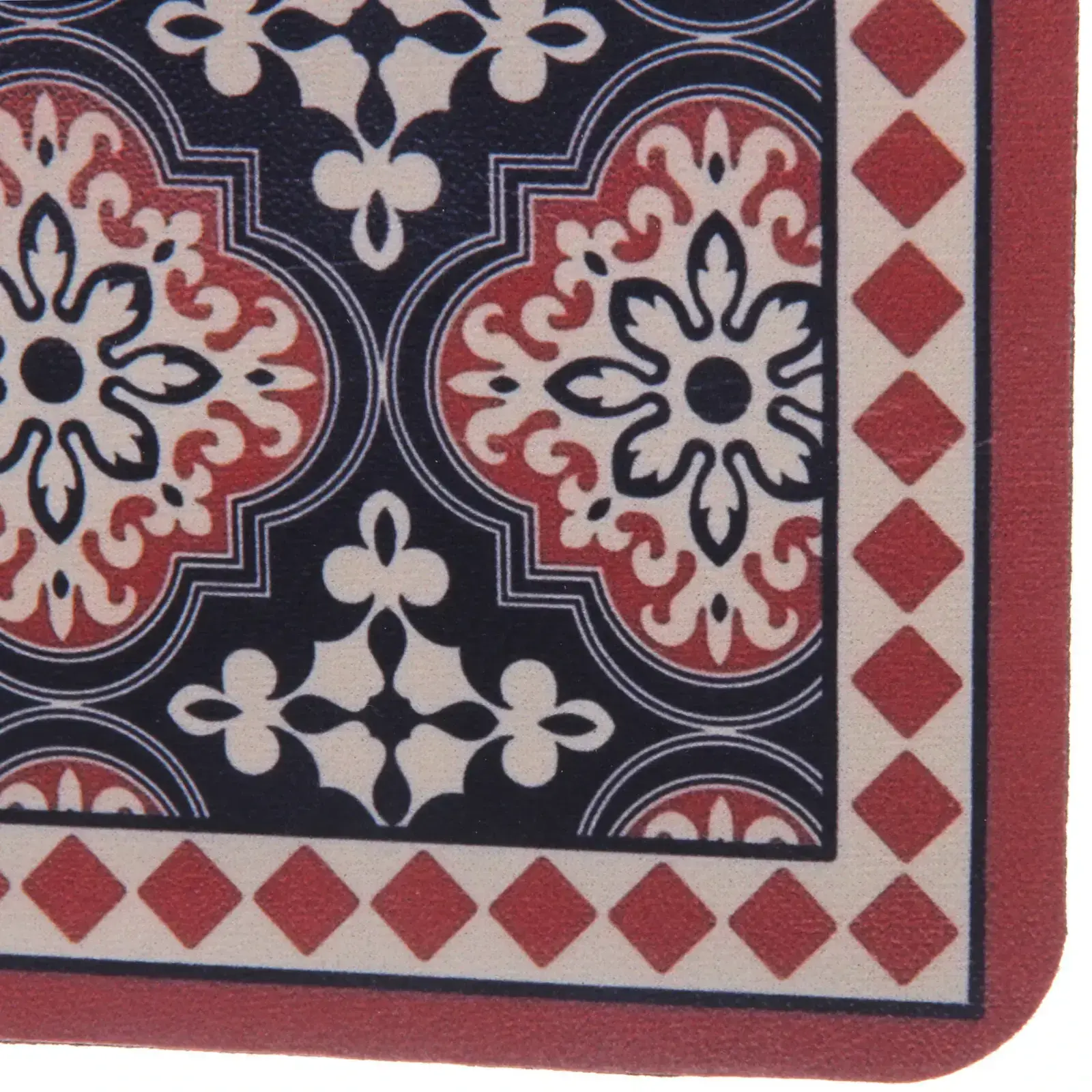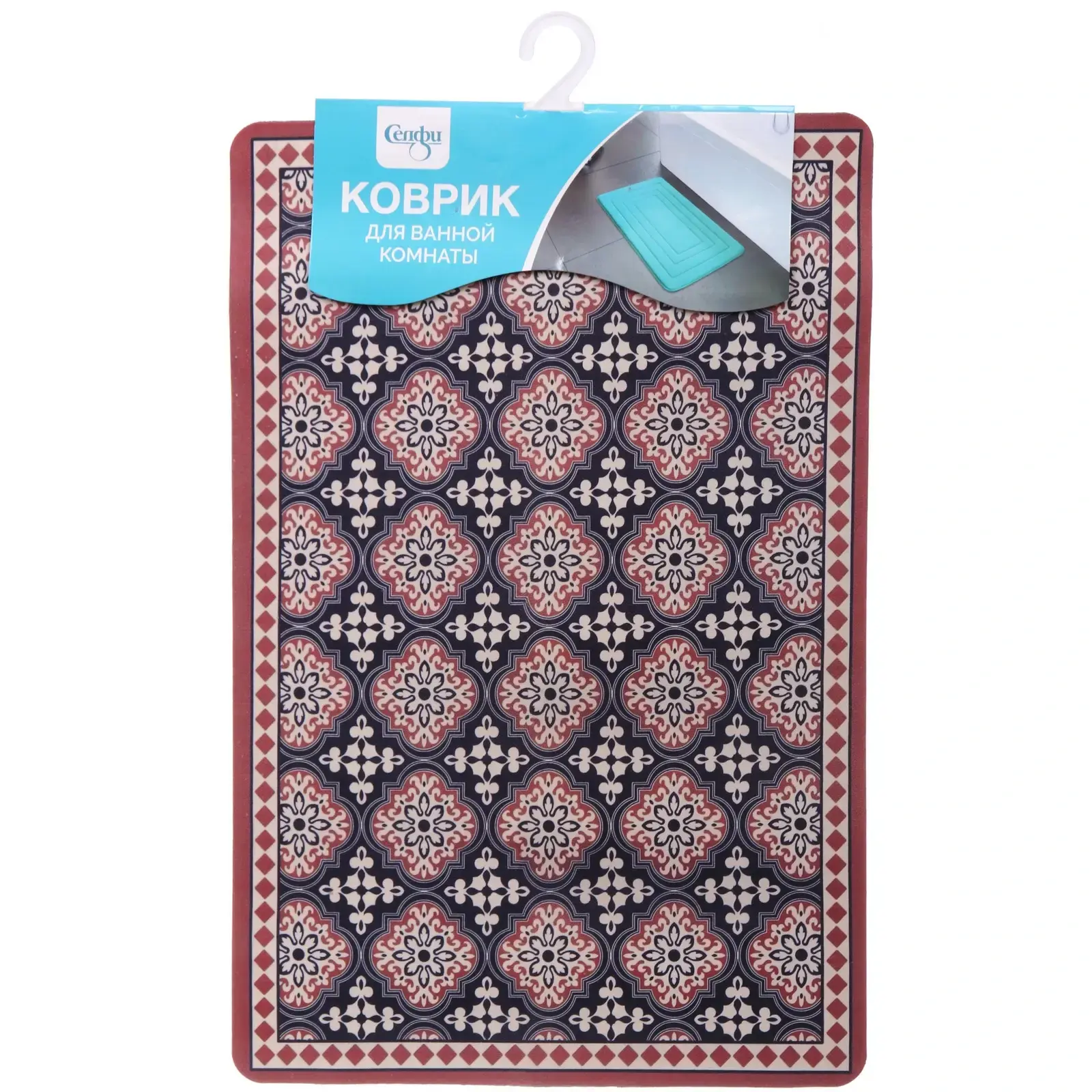 Коврик имеет прямоугольную форму и обрамлен бордюром с ромбовидным узором, что придает ему дополнительный шарм. Изготовленный из ПВХ, он сочетает в себе прочность и элегантность. Не сушите коврик на батарее и избегайте солнечных лучей, чтобы продлить его срок службы.