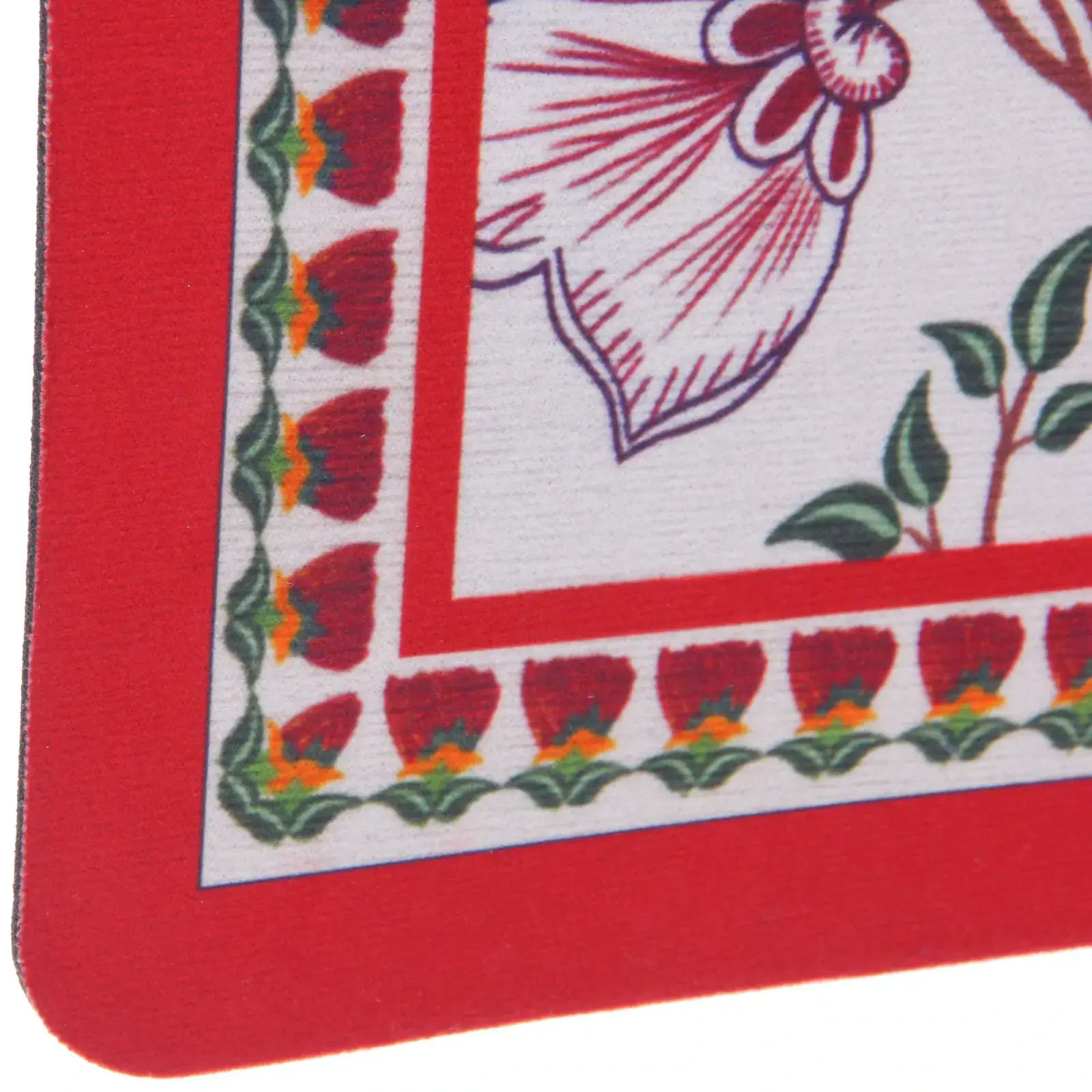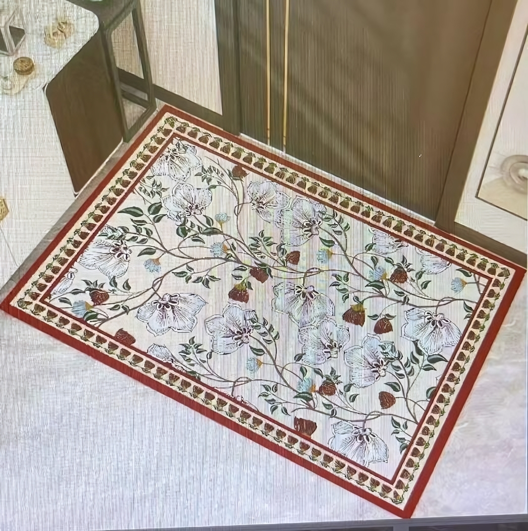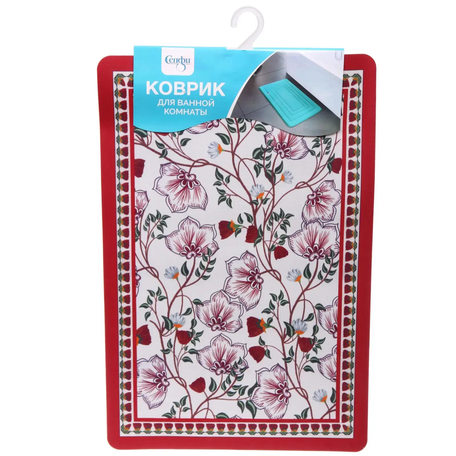 Коврик имеет гладкую текстуру, что облегчает его очистку. Красный бордюр добавляет яркости и стиля, а цветочный узор с зелеными листьями создает атмосферу свежести и природной красоты. Этот коврик станет не только функциональным, но и эстетически привлекательным элементом вашего интерьера.