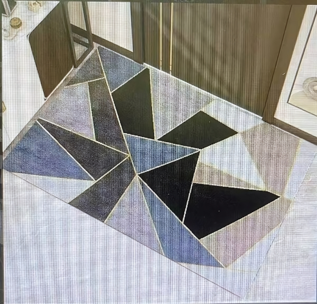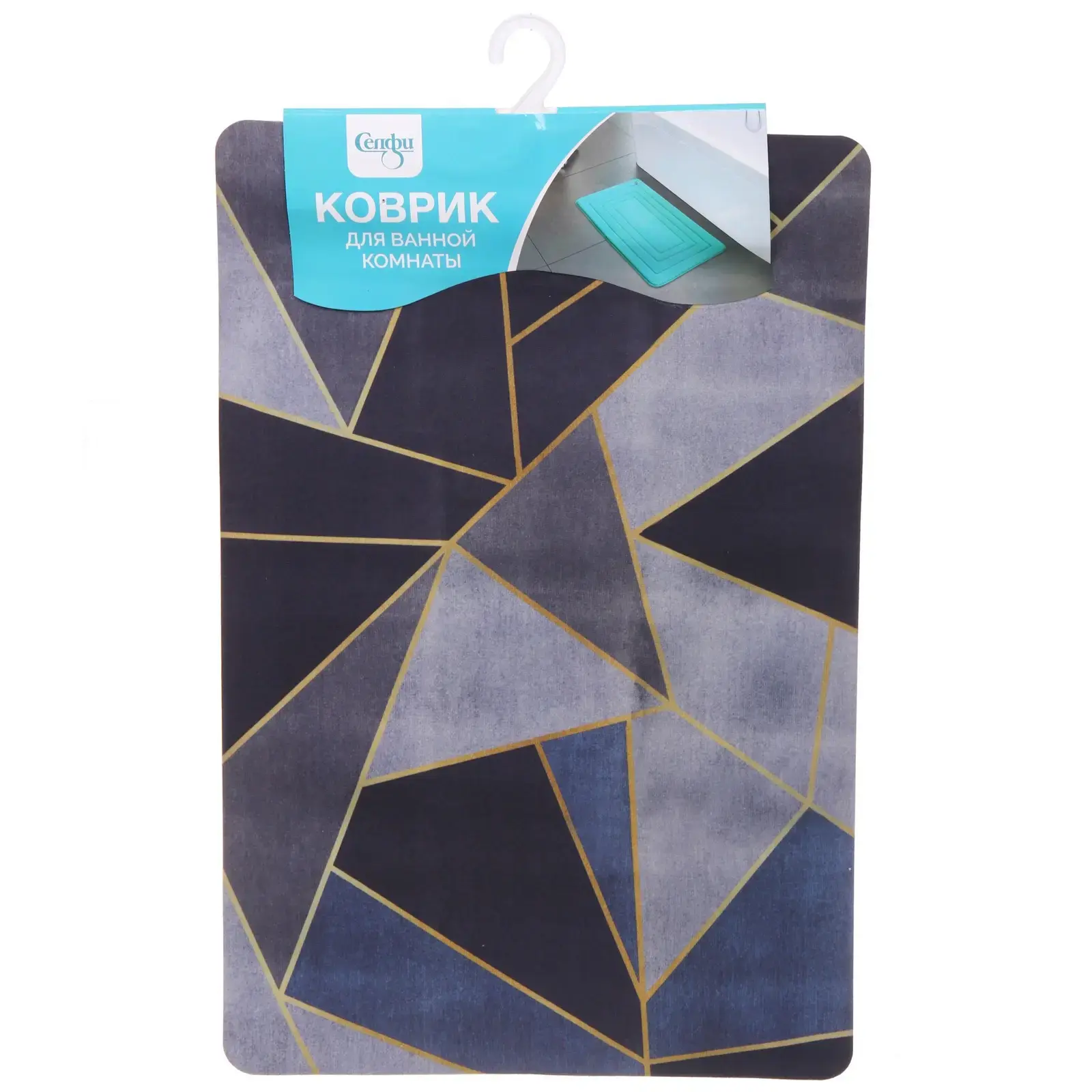 Коврик подходит для использования как в ванной, так и в туалете. Он легко чистится и быстро сохнет, что делает его практичным выбором для повседневного использования. Вы можете использовать его в любом интерьере, благодаря универсальному дизайну с геометрическим узором в серых и синих тонах, обрамленным золотыми линиями.