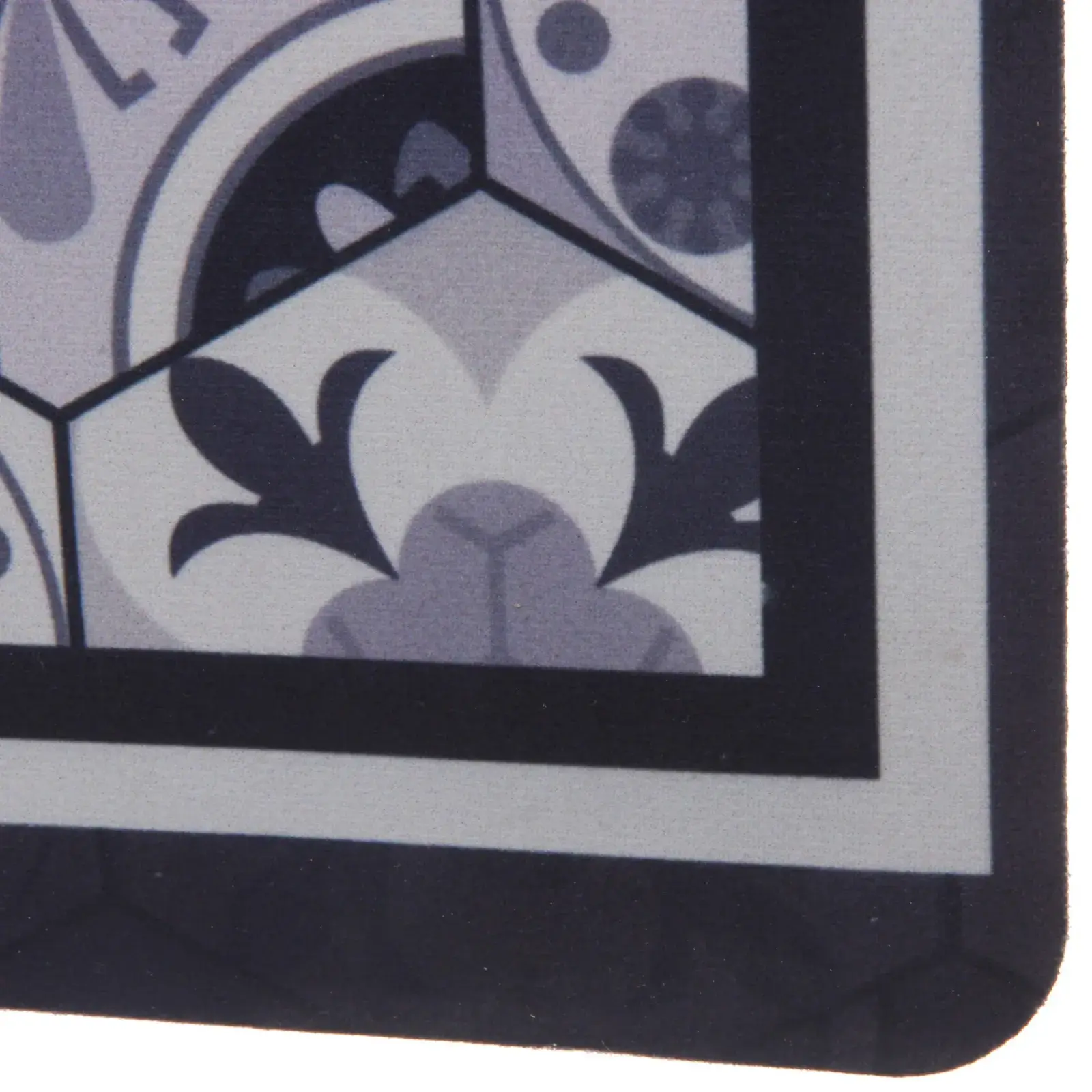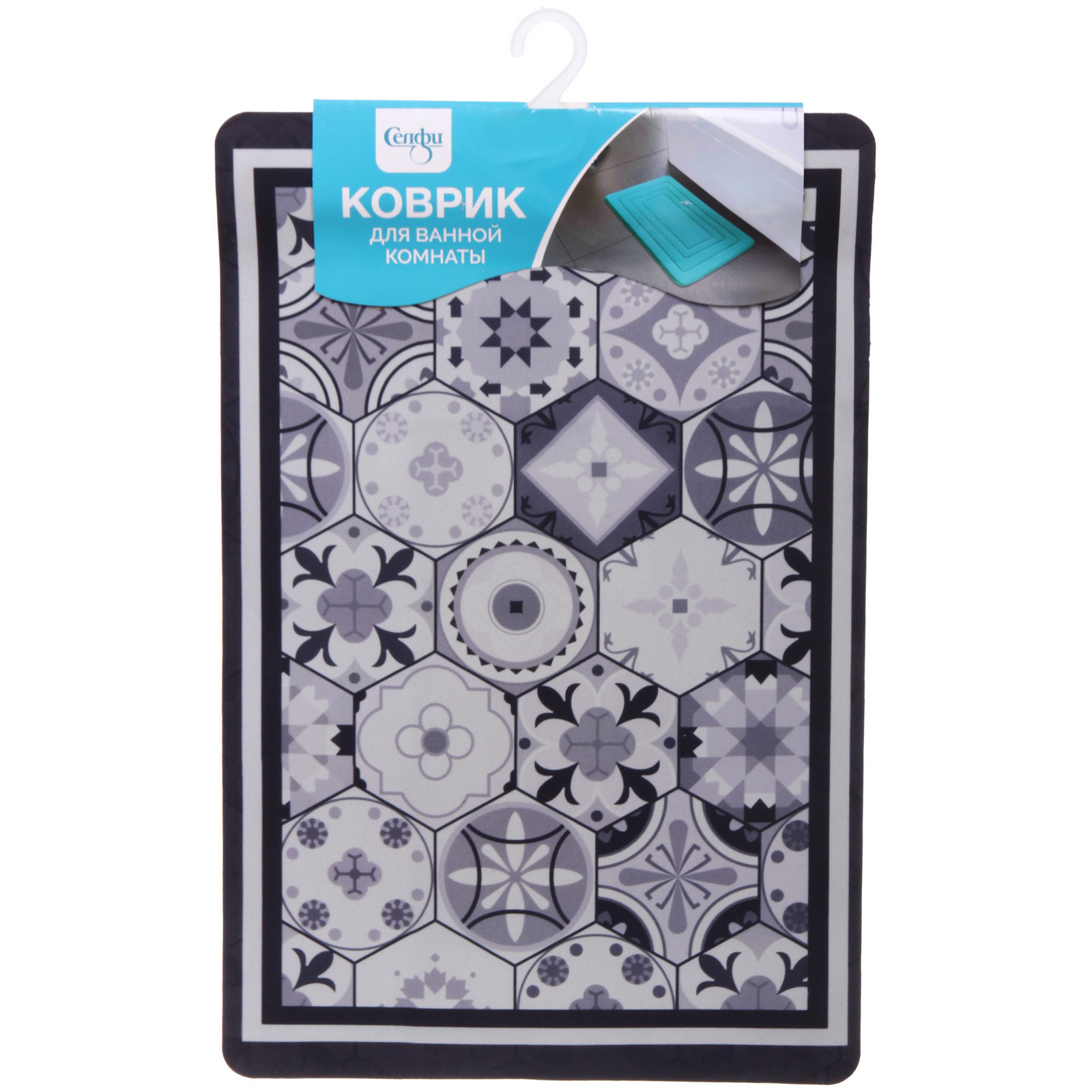 Размер коврика составляет 38х58 см, что делает его универсальным для различных пространств. Он выполнен из ПВХ, что обеспечивает его прочность и устойчивость к влаге. Цветовая гамма включает серые и черные оттенки с разнообразными узорами, что позволяет легко вписать его в любой интерьер.