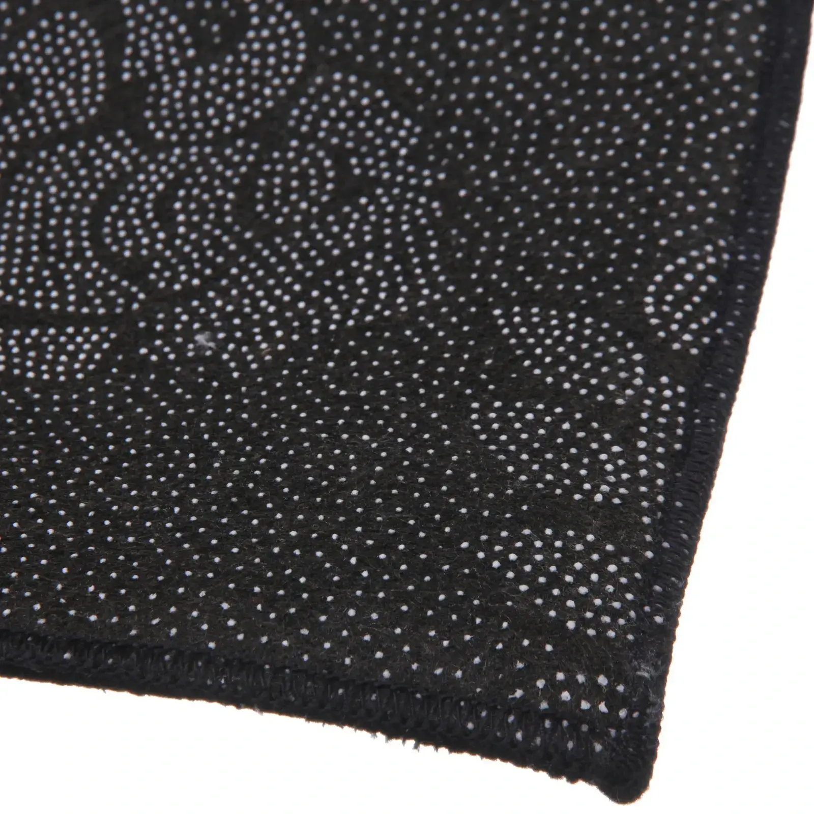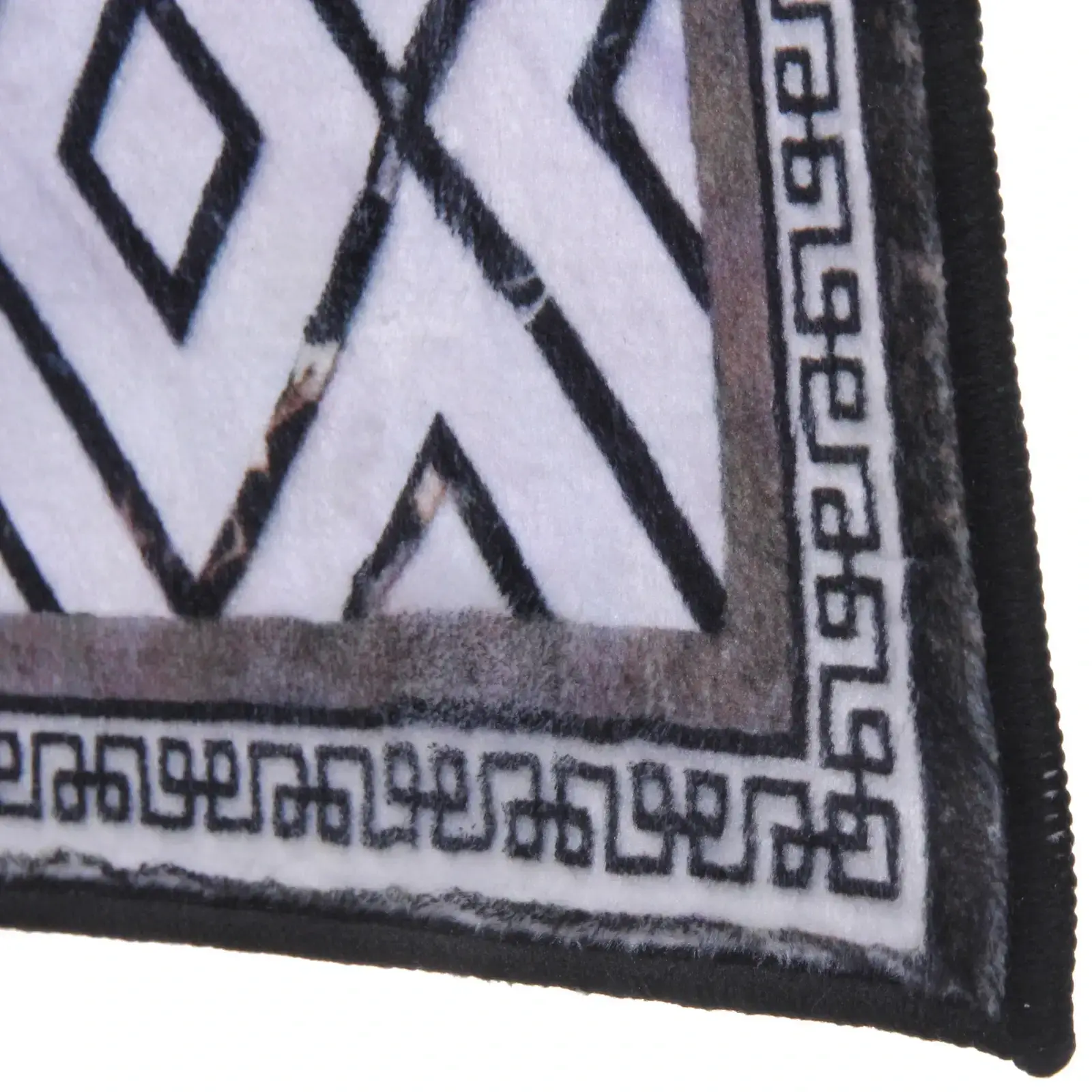 Коврик выполнен из полиэстера, что обеспечивает его долговечность и практичность. Черная окантовка по периметру добавляет завершенности и защищает края от износа. Этот коврик станет не только функциональным элементом, но и стильным акцентом в вашем доме.