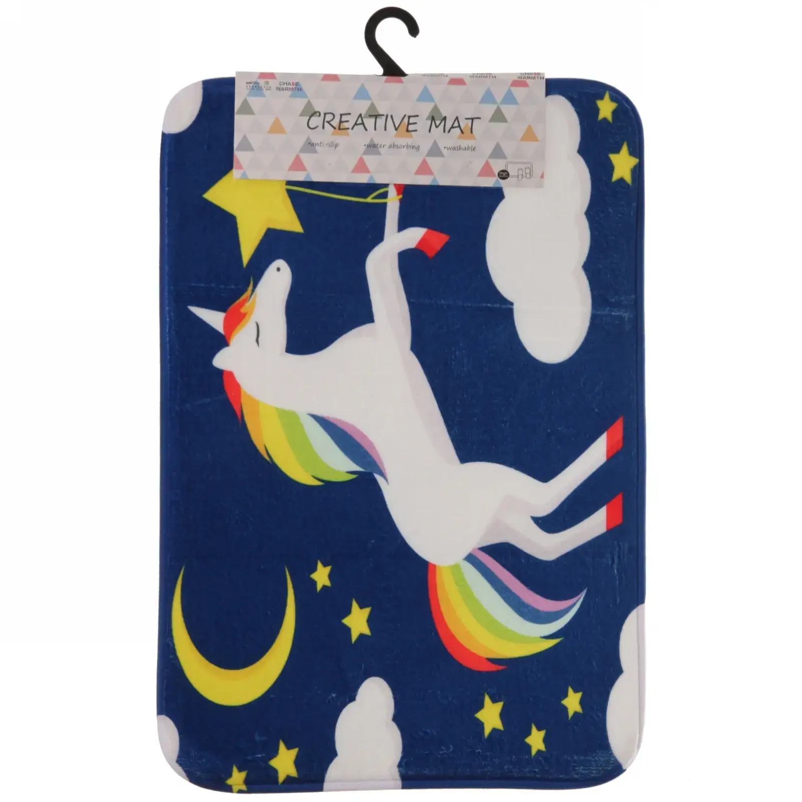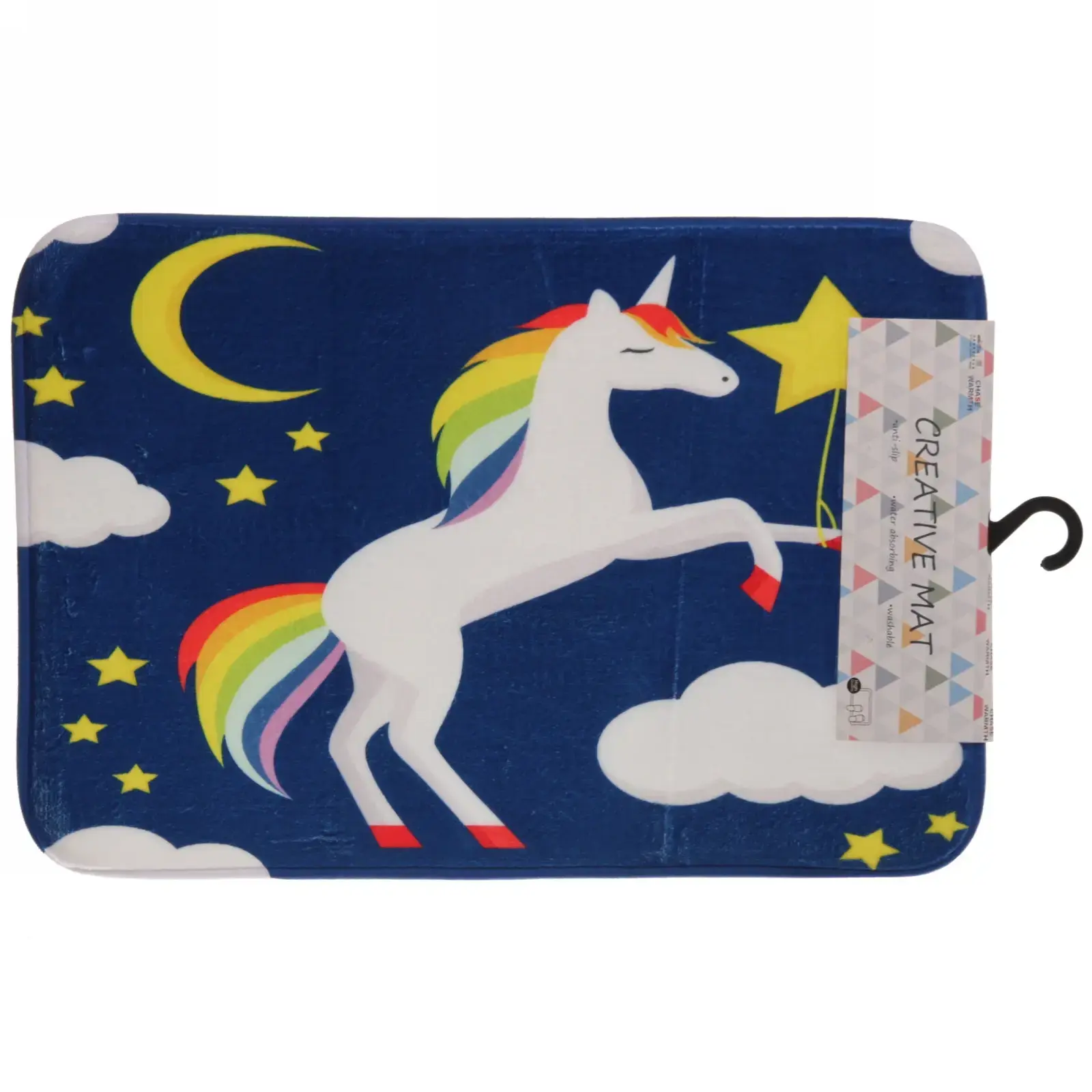 Размер коврика составляет 40х60 см, что делает его идеальным для размещения перед ванной или раковиной. Темно-синий цвет с яркими элементами дизайна (единорог, звезды, луна) создает магическую атмосферу и особенно понравится детям.