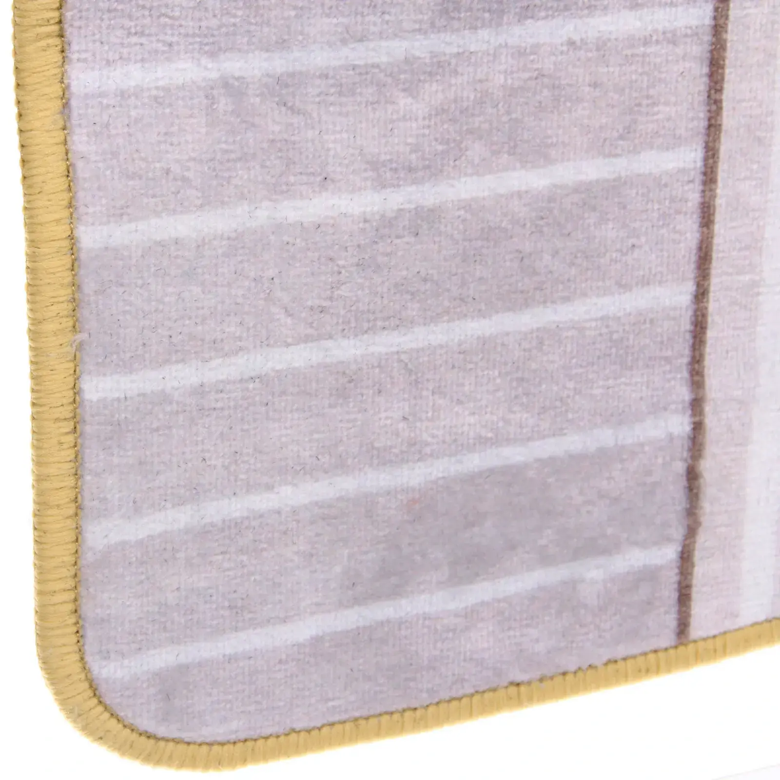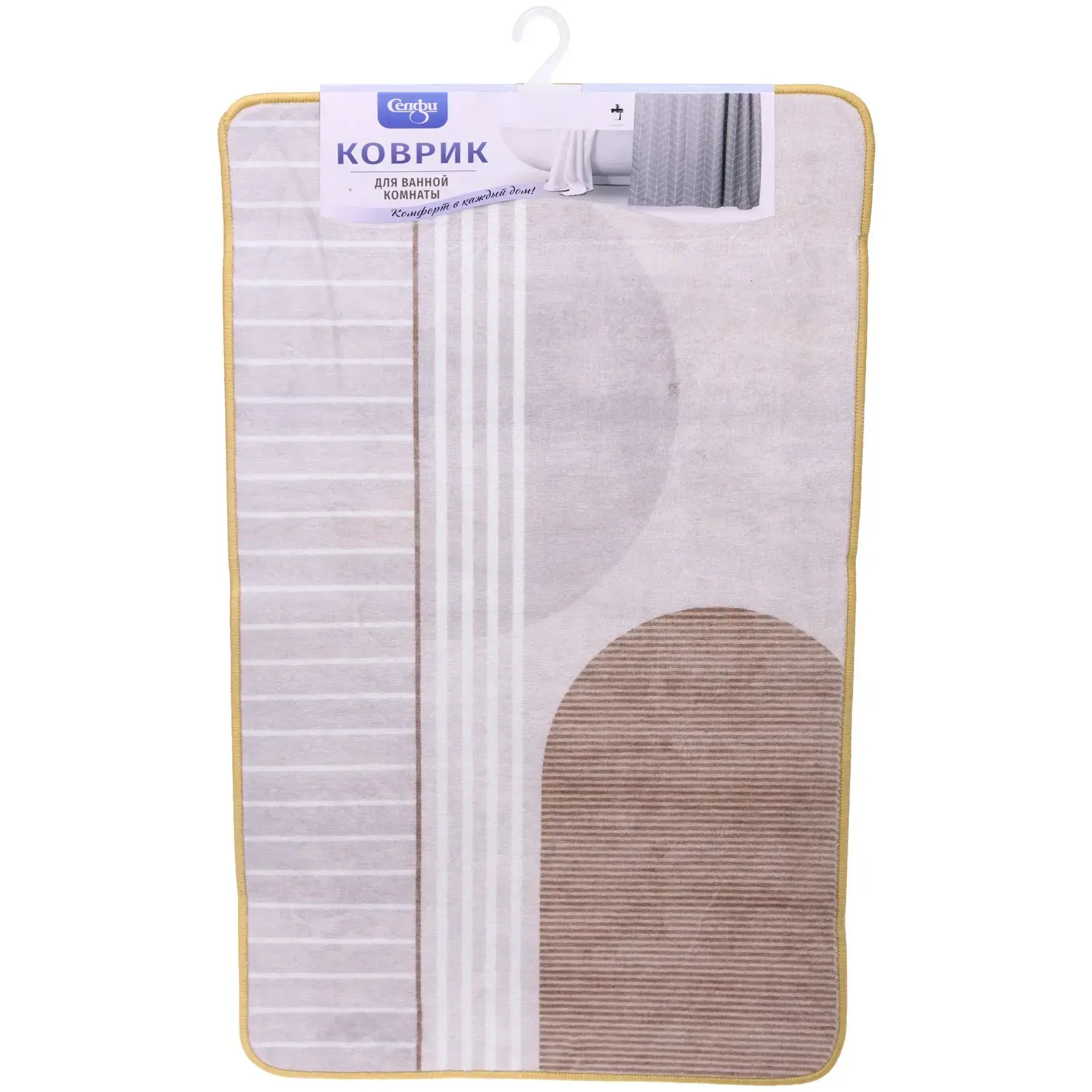 Размер коврика составляет 50х80 см, что делает его универсальным для большинства ванных комнат. Цветовая гамма включает бежевый и коричневый оттенки, что позволяет легко сочетать его с другими элементами интерьера. Окантовка желтого цвета добавляет яркий акцент и делает коврик более привлекательным.