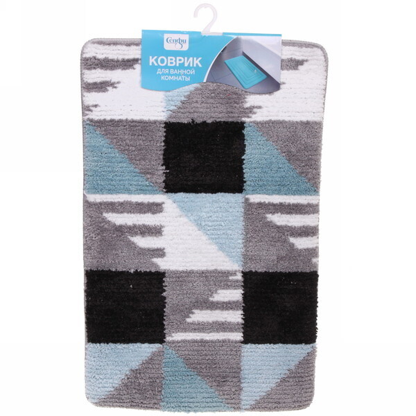 Коврик изготовлен из полиэстера, что обеспечивает его долговечность и простоту в уходе. Основные цвета — серый, черный и голубой, что позволяет легко сочетать его с другими элементами интерьера. Не упустите возможность добавить этот стильный и практичный коврик в вашу ванную комнату!