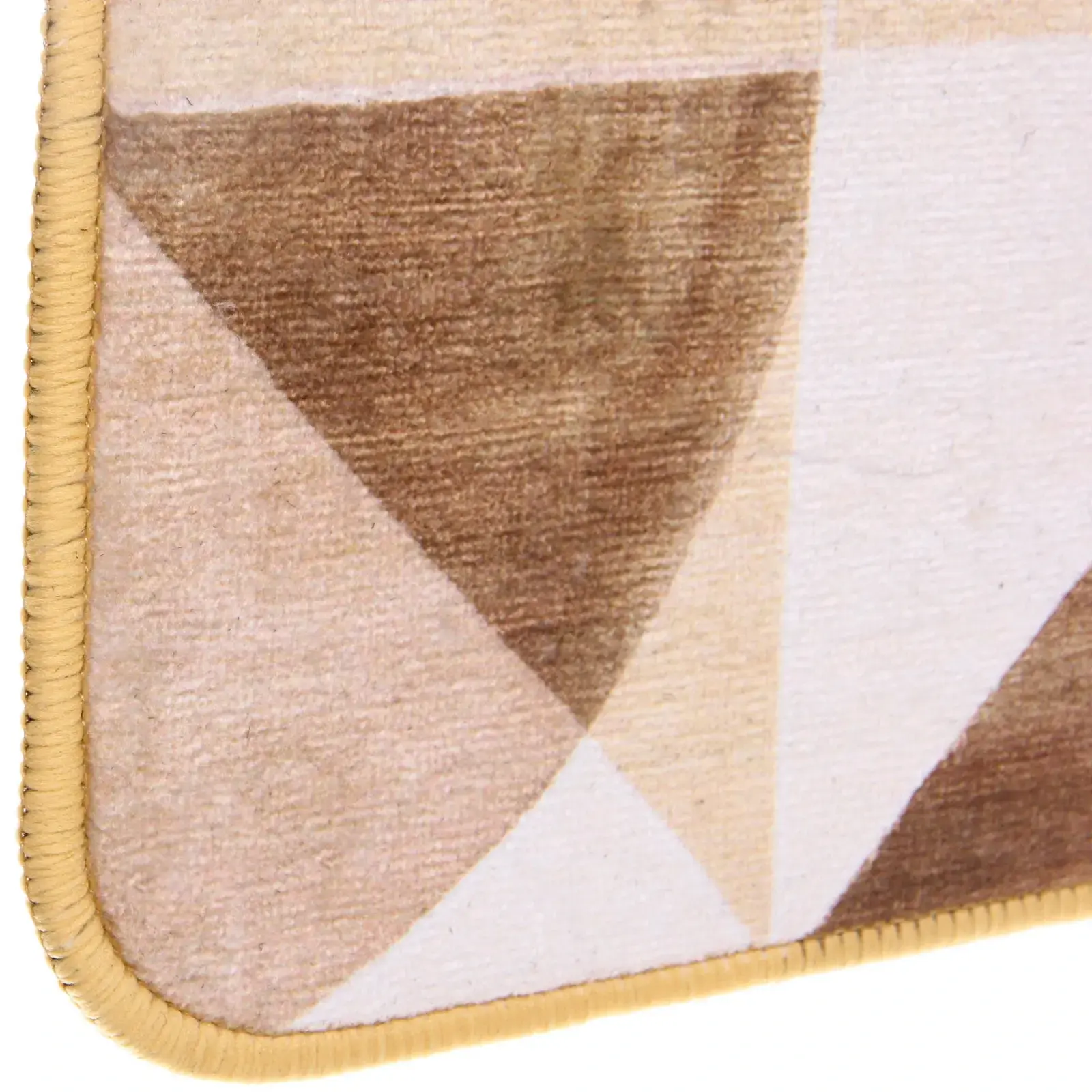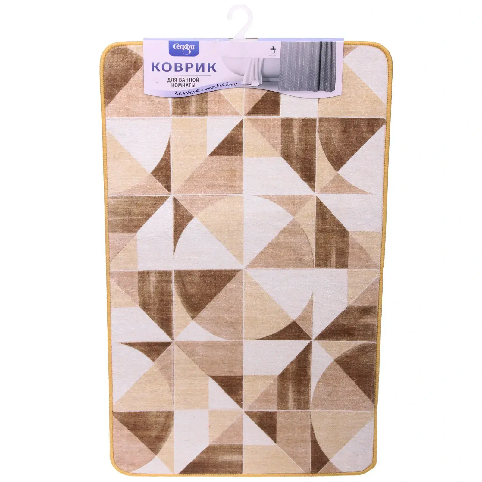 Размер коврика составляет 50х80 см, что делает его универсальным для большинства ванных комнат. Цветовая гамма включает теплые бежевые и коричневые оттенки, что добавляет уют и гармонию в ваше пространство. Обрамление коврика выполнено в желтом цвете, что создает яркий акцент.