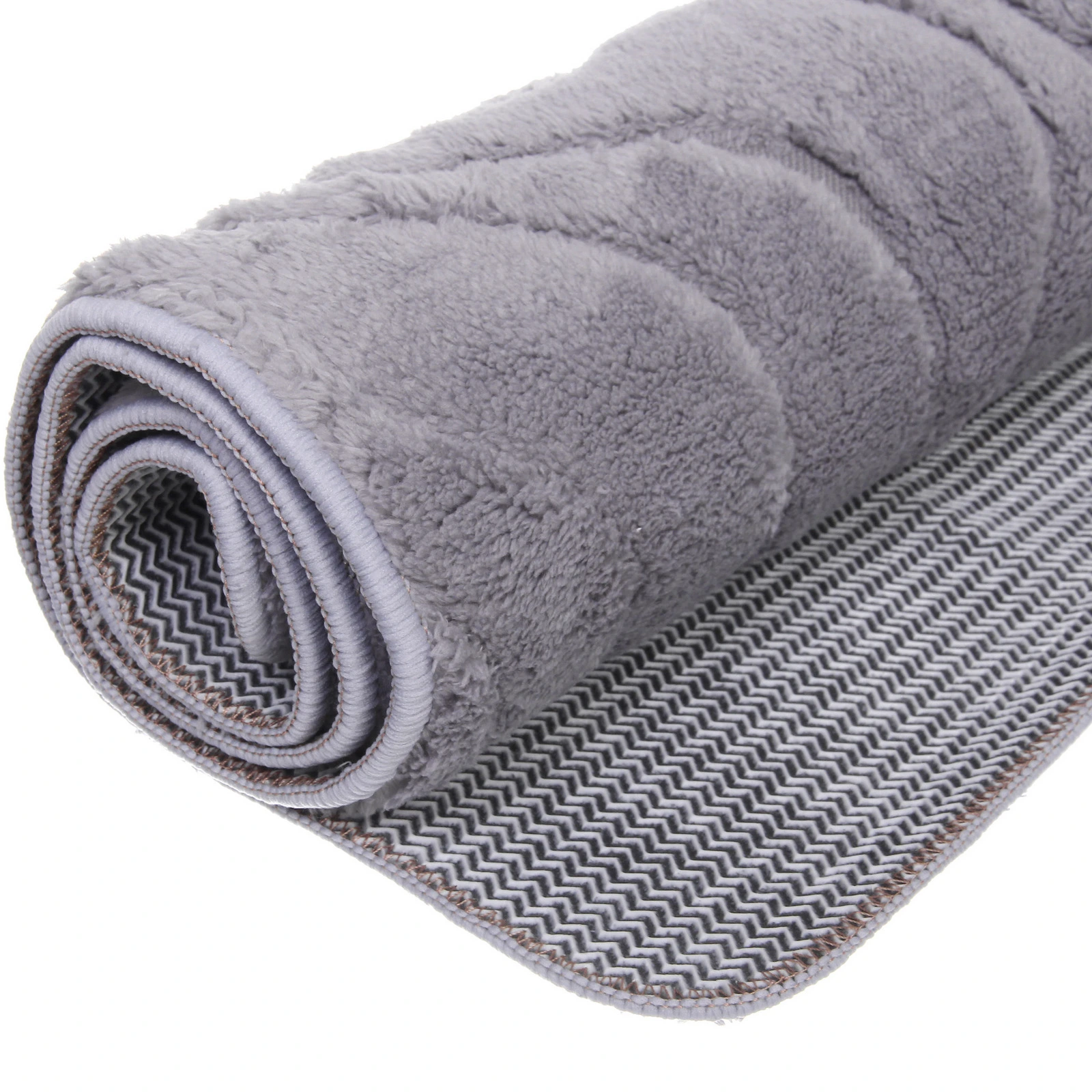Коврик подходит для размещения возле ванны, душевой кабины или раковины. Благодаря увеличенному размеру он закрывает большую площадь пола, обеспечивая комфортное перемещение и защищая поверхность от влаги. Противоскользящая основа с геометрическим рисунком снижает риск смещения коврика на гладкой плитке.
