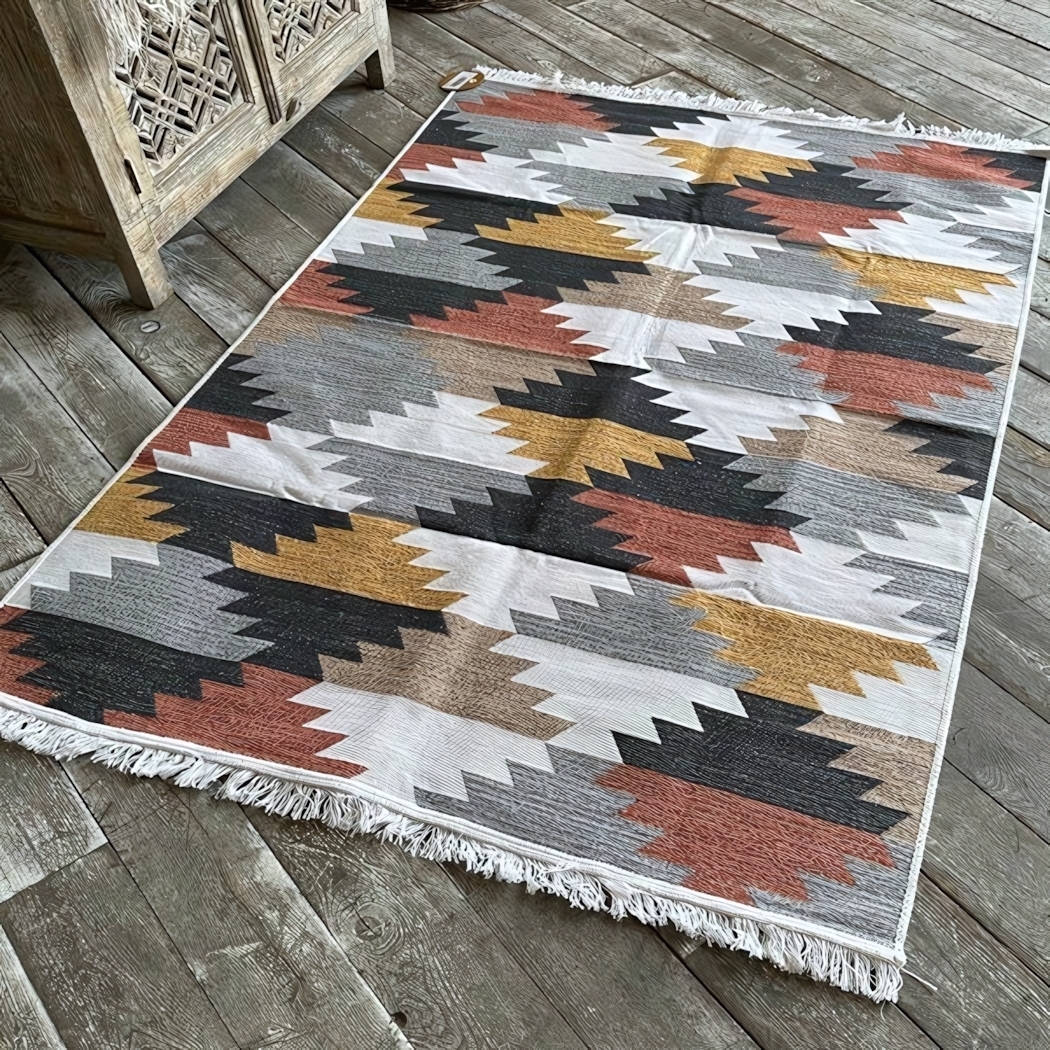Создайте уют в вашем доме с помощью нашего двухстороннего коврика с бахромой. Этот коврик не только украсит ваш интерьер, но и обеспечит комфорт при ходьбе. Его стильный геометрический узор в серых и черных тонах легко впишется в любой дизайн, добавляя изысканности и современности.