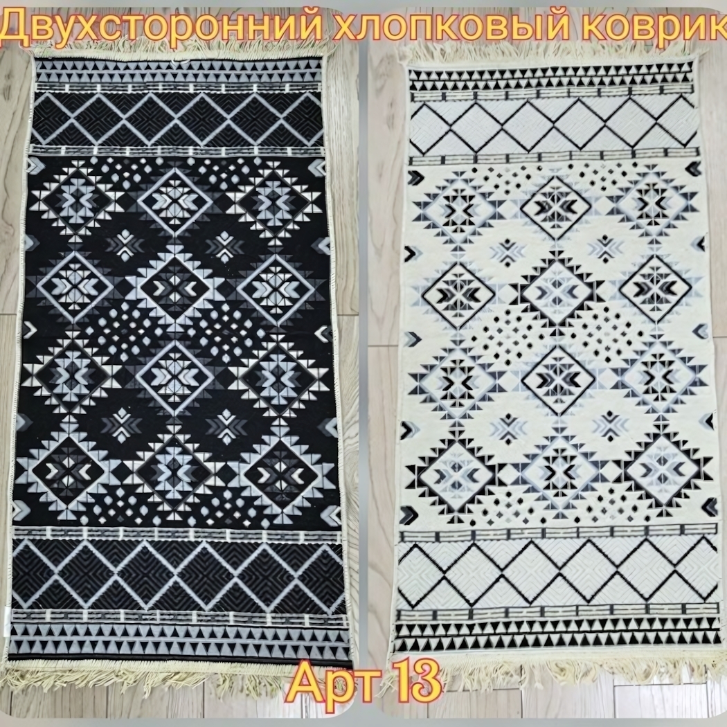 Создайте атмосферу комфорта с двухсторонним интерьерным ковриком размером 60х120 см. Его уникальный геометрический узор в черно-белых тонах станет изысканным акцентом в вашем интерьере.
