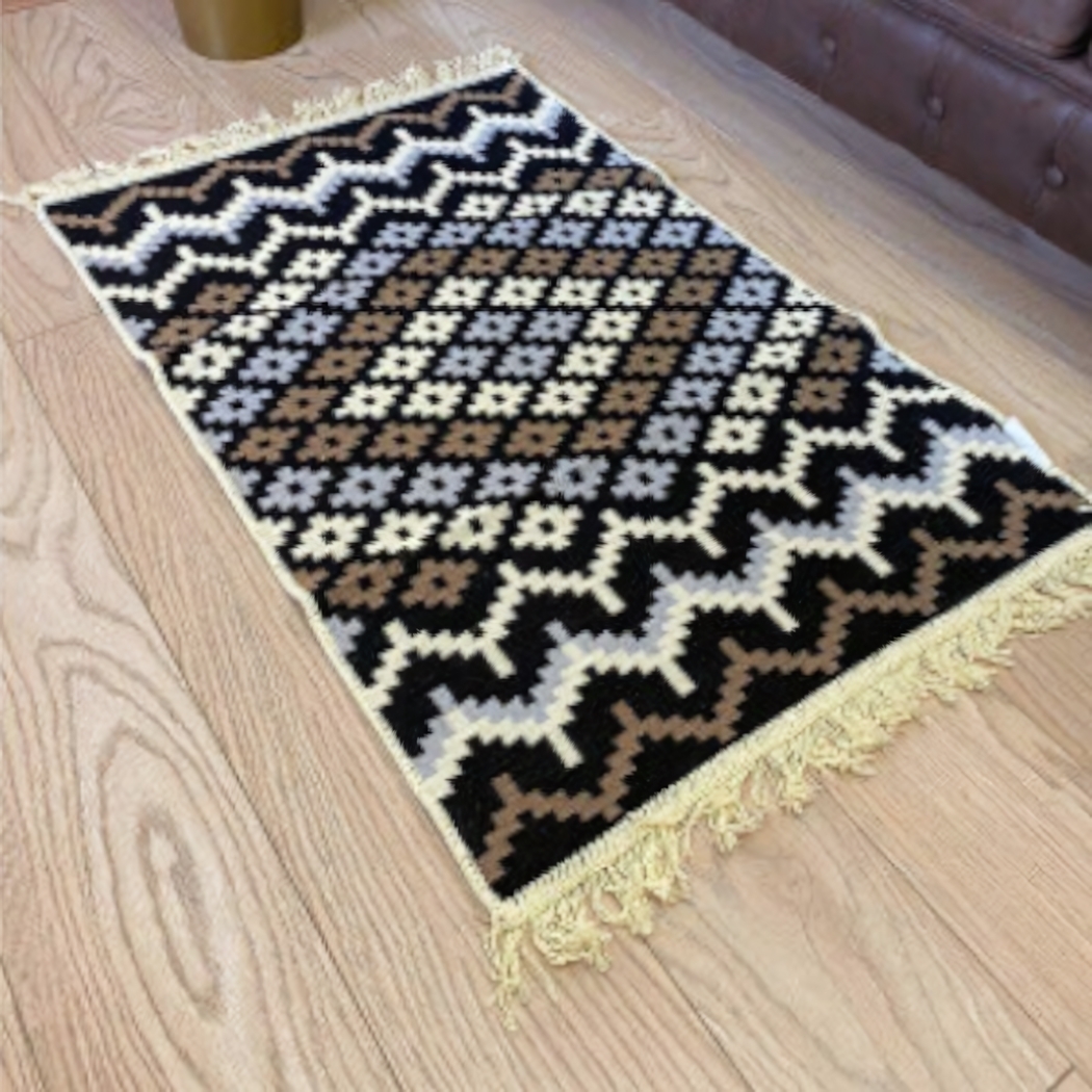 Цветовая гамма коврика включает черный, коричневый, серый и белый цвета, что позволяет легко сочетать его с другими элементами интерьера. Бахрома по краям добавляет изысканности и завершенности. Не упустите возможность сделать ваш дом более уютным и стильным с нашим ковриком!