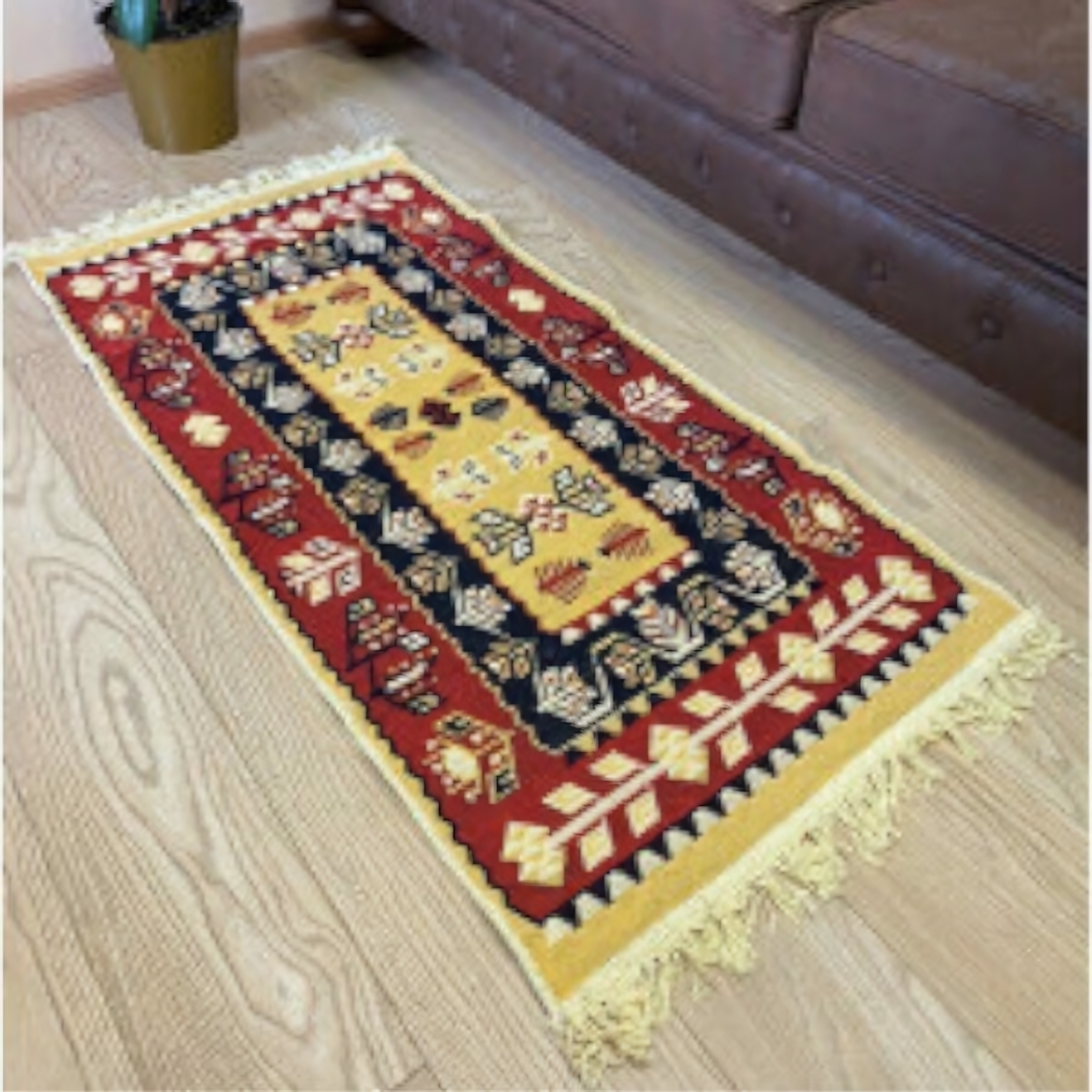 Основные цвета коврика — красный, жёлтый и тёмно-синий, что позволяет легко сочетать его с различными стилями интерьера. Края коврика украшены бахромой, что придаёт ему дополнительный шарм. Не упустите возможность сделать ваш дом более уютным и стильным с этим великолепным ковриком!