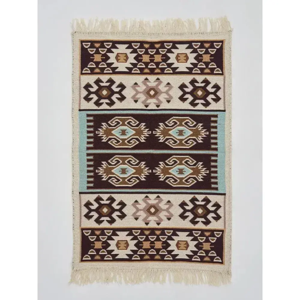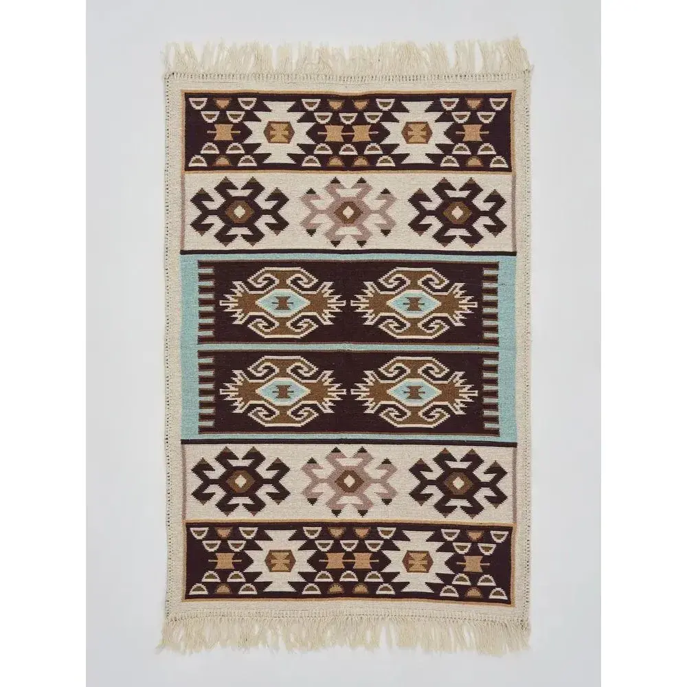 Тканевый коврик с этническими узорами создаёт атмосферу тепла и комфорта в ванной комнате. Геометрический орнамент в бежево-коричневых тонах с голубыми акцентами добавляет стильный штрих в оформление пространства.