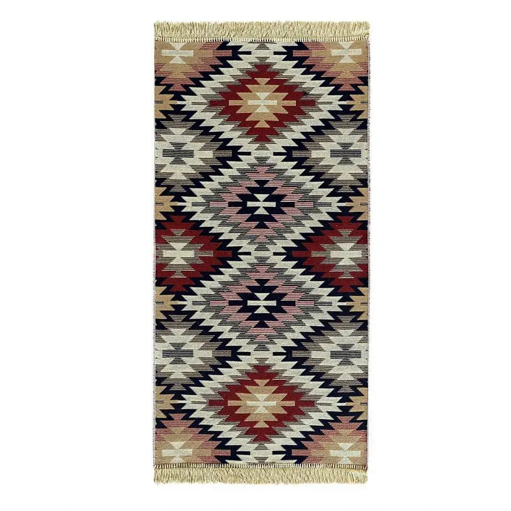Турецкий коврик Kilim «GOLD» сочетает традиционное ремесло и современный дизайн. Его многоцветные узоры из ромбов и треугольников создают атмосферу тепла, а бахрома по краю добавляет декоративности. Идеально подходит для зонирования пространства в ванной, прихожей или кухне.