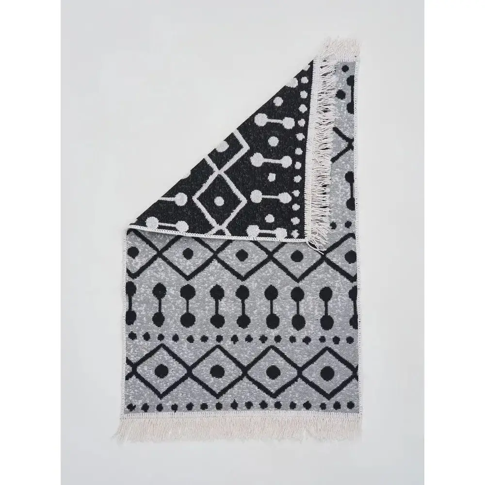 Двусторонний графический принт сочетает геометрические мотивы с этническими элементами: пересекающиеся линии создают динамику, а точечные вкрапления добавляют рисунку глубины. Сочетание чёрного и белого цветов делает коврик нейтральным элементом декора, который гармонирует с любой палитрой интерьера.