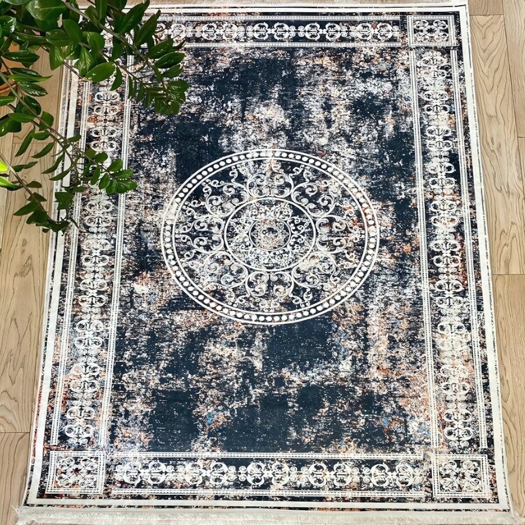 Коврик выполнен из качественного текстильного материала, который обеспечивает долговечность и практичность. Тёмно-синий фон с белым и оранжевым узором добавляет яркие акценты в ваш интерьер, а сложный рамочный узор с завитками придаёт ему изысканный вид. Этот коврик не только украсит ваш дом, но и создаст комфортное пространство для отдыха и общения.