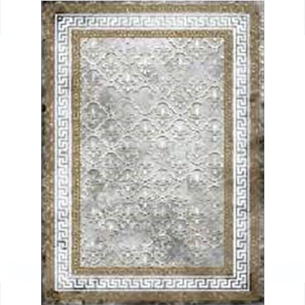 Переливы серебристых и золотистых оттенков создают эффект игры света, а контрастная белая окантовка подчеркивает геометрию узора. Благодаря нейтральной цветовой гамме коврик сочетается с любым стилем интерьера — от классики до лофта.
