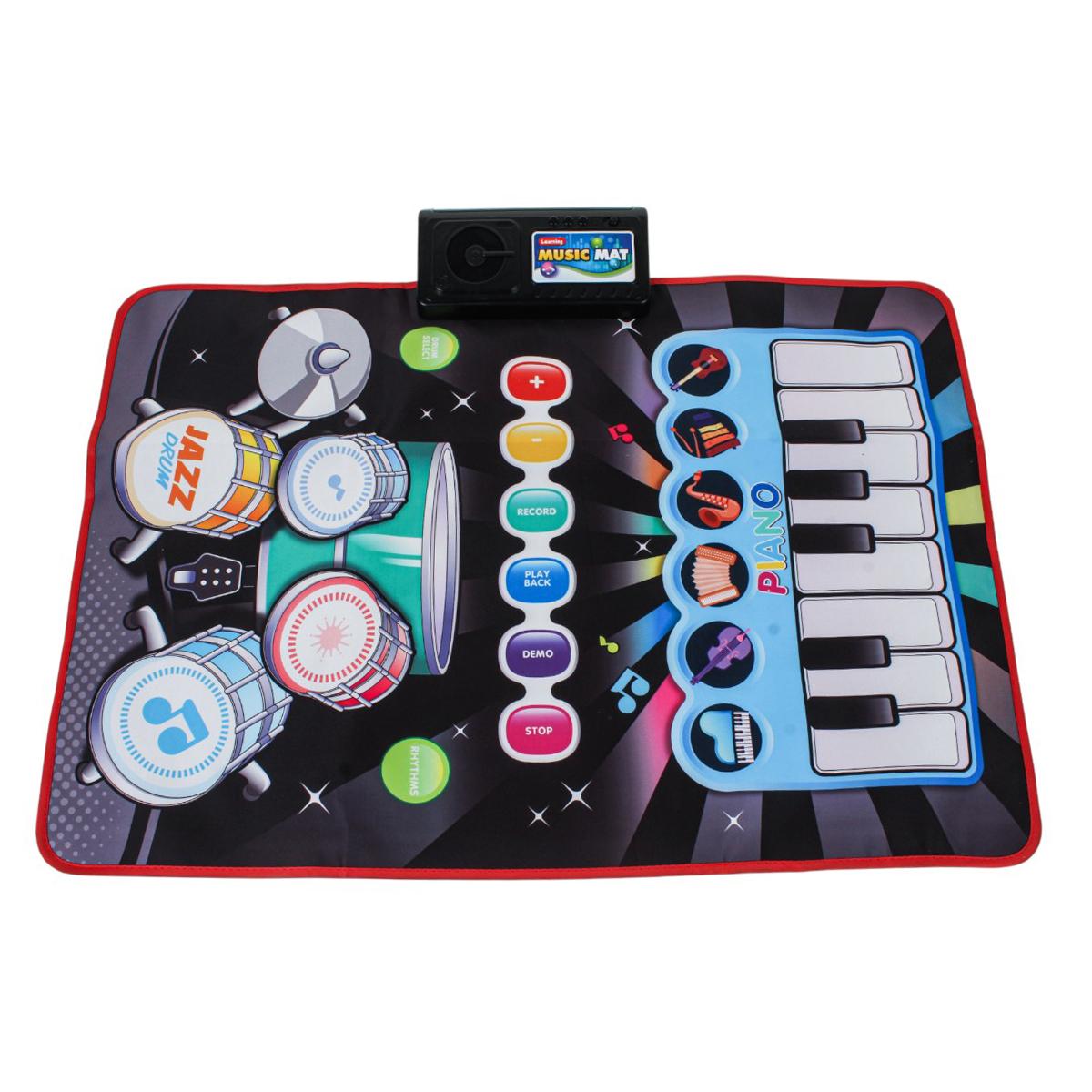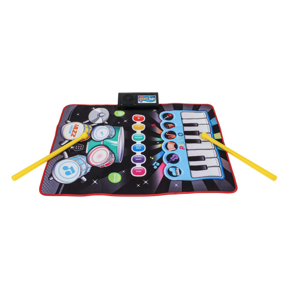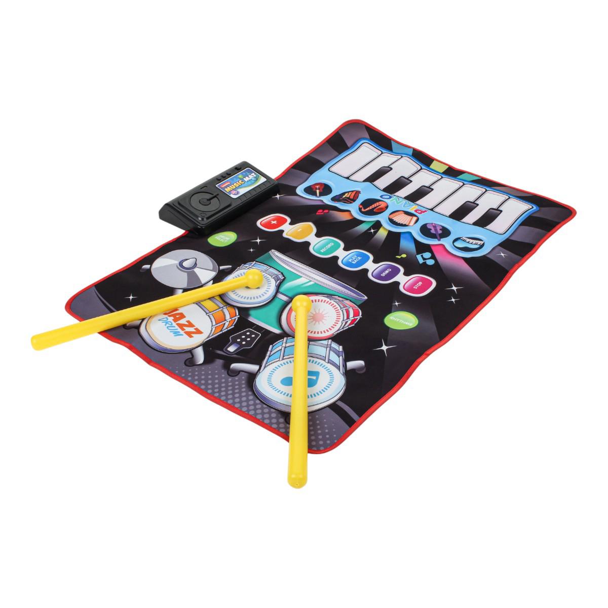 Коврик сочетает в себе пианино и барабанную установку, позволяя выбирать разные режимы и ритмы. Управляющий модуль оснащён кнопками записи, воспроизведения, демо и остановки, что даёт ребёнку возможность сочинять и прослушивать свои музыкальные композиции. В комплекте предусмотрены 2 барабанные палочки для полноценной игры.
