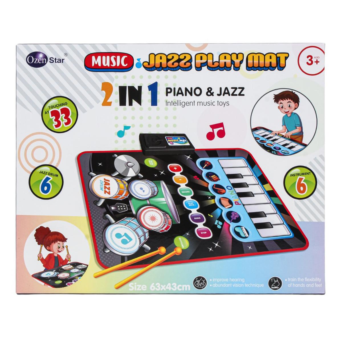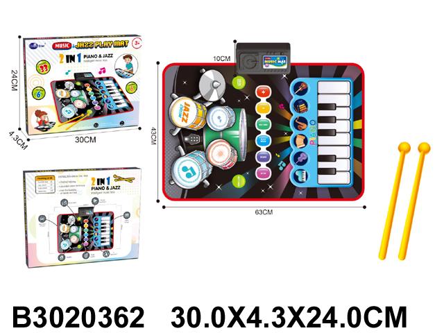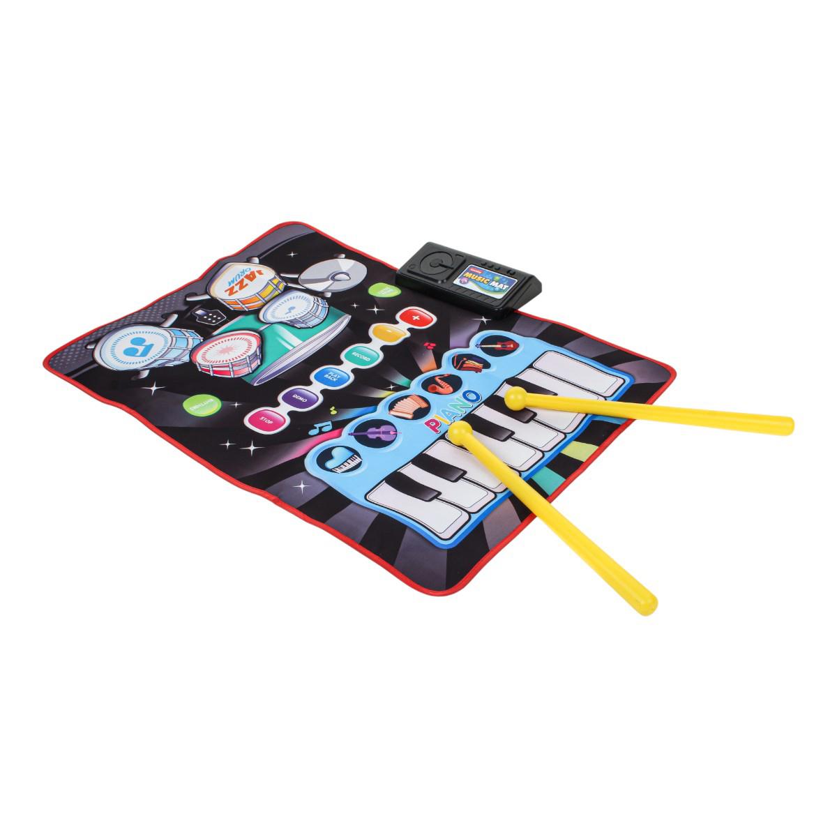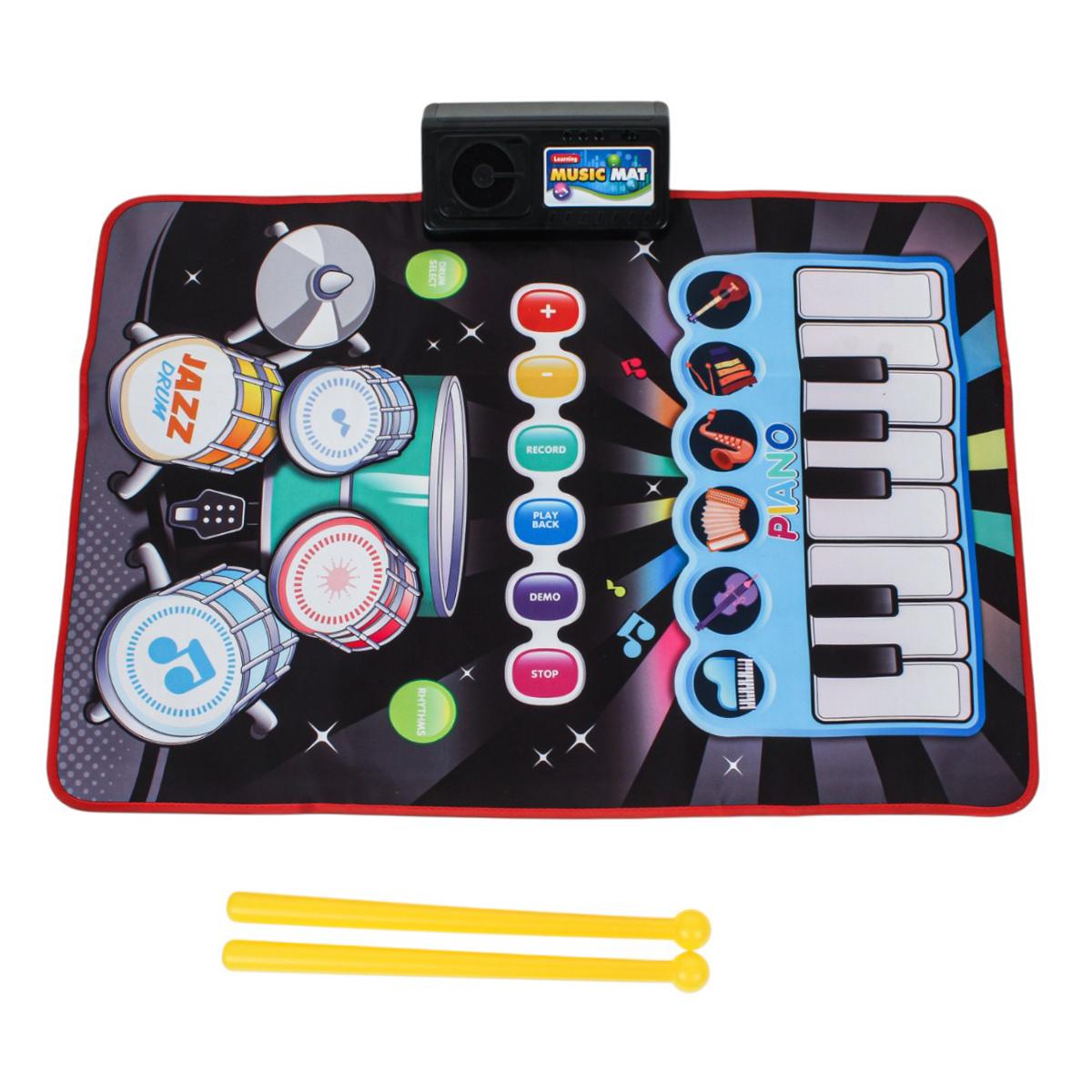 Коврик сочетает в себе пианино и барабанную установку, позволяя выбирать разные режимы и ритмы. Управляющий модуль оснащён кнопками записи, воспроизведения, демо и остановки, что даёт ребёнку возможность сочинять и прослушивать свои музыкальные композиции. В комплекте предусмотрены 2 барабанные палочки для полноценной игры.