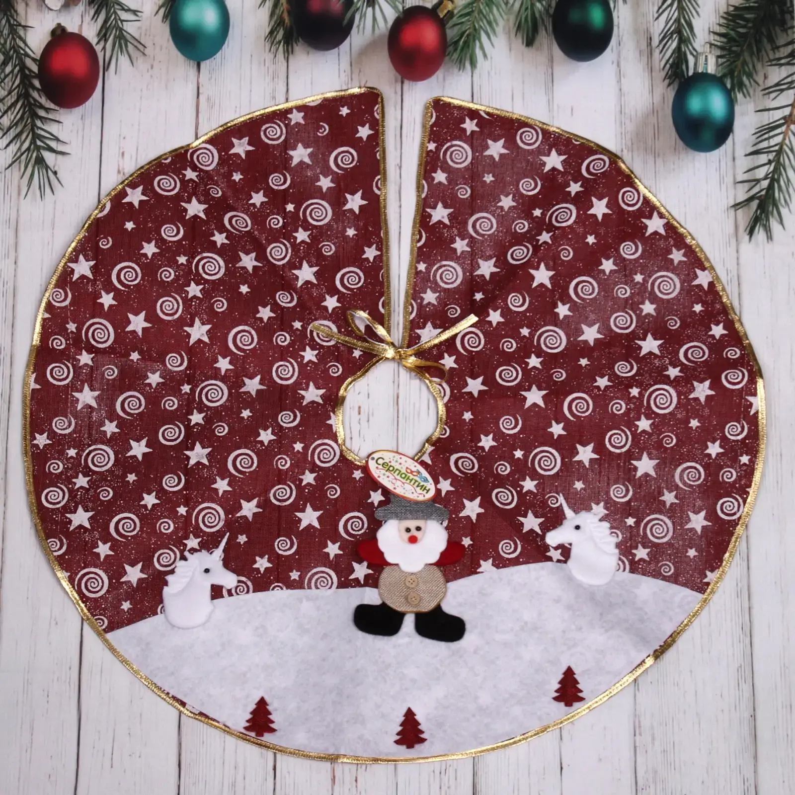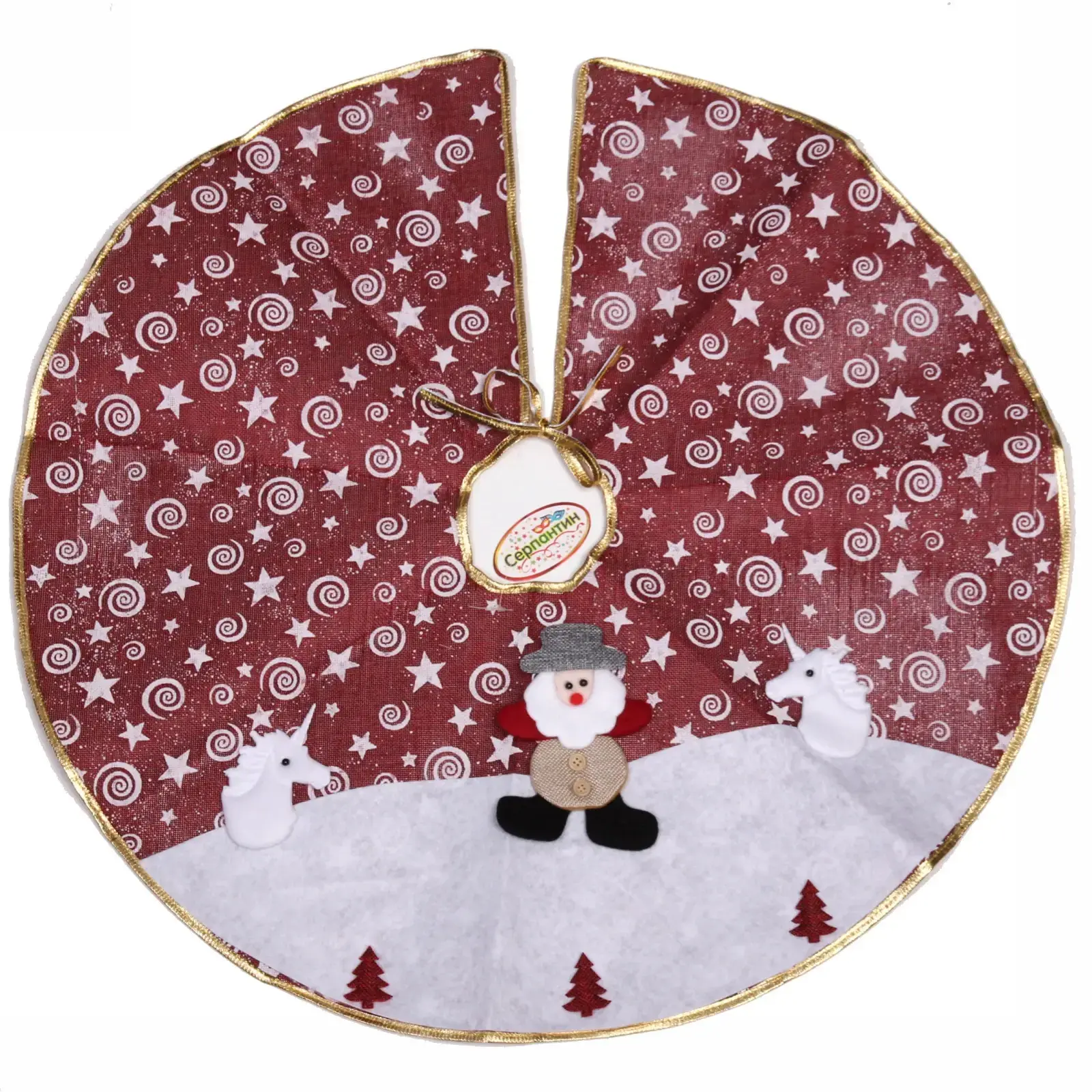 Выбирая коврик под ёлку JOLLY, вы получаете не только красивый, но и функциональный элемент декора. Яркий красный цвет с белыми спиралями и звездами, а также декоративные элементы в виде снеговика и единорогов создают праздничное настроение. Золотистый кант по краю добавляет изысканности и стиля. Этот коврик станет отличным дополнением к вашему новогоднему декору и привлечет внимание гостей.