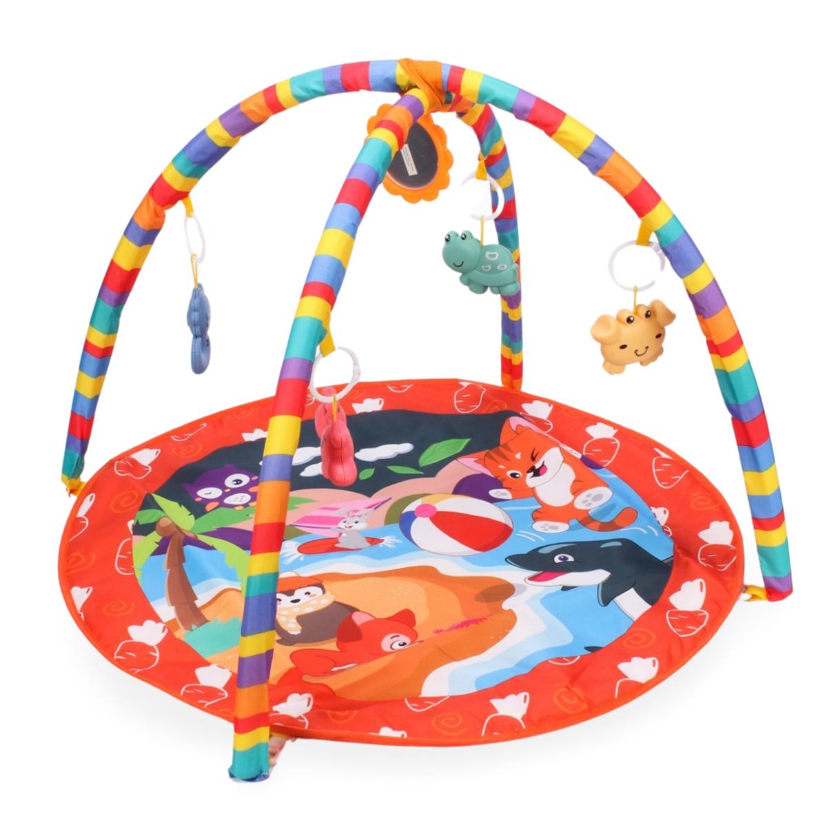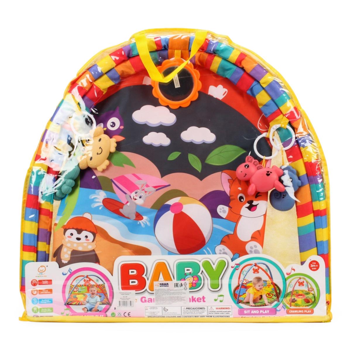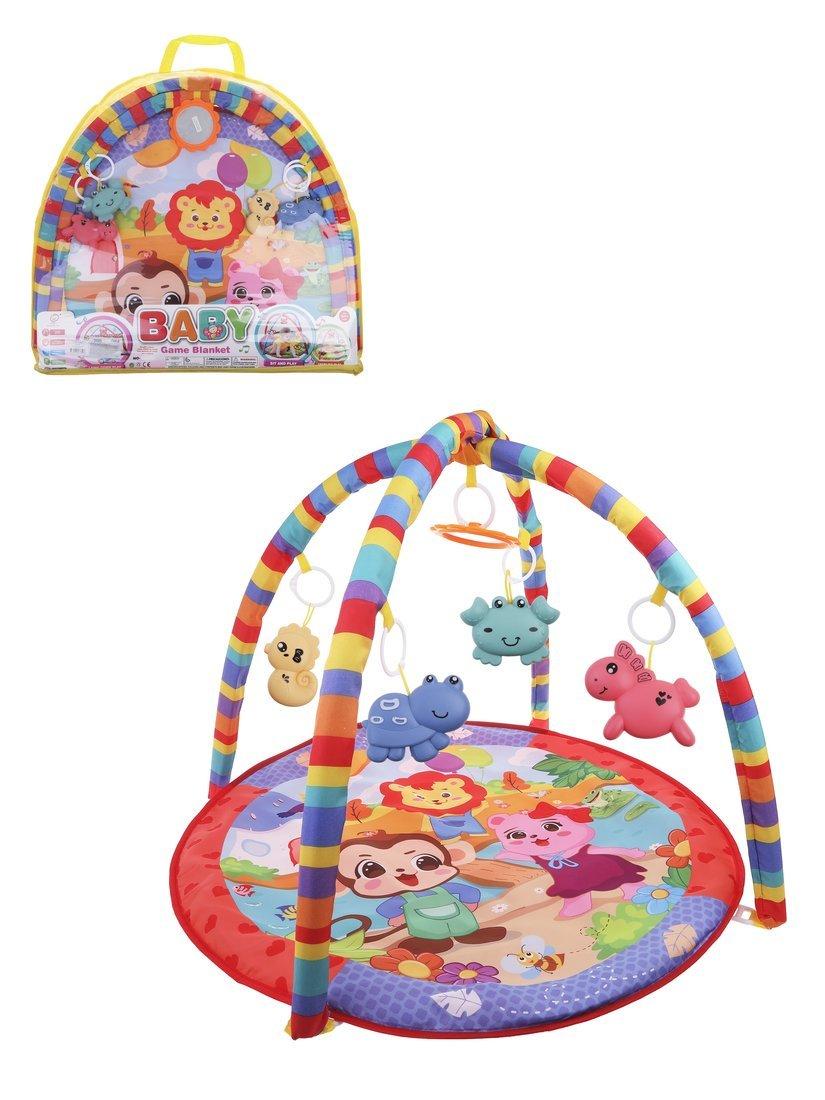 Этот мягкий и безопасный коврик идеально подходит для детей от рождения и до ползания. Благодаря ярким цветам, мультяшным иллюстрациям и нескольким мягким игрушкам, он способствует развитию зрительного восприятия, моторики и тактильных ощущений. Над ковриком расположены дуги, к которым прикреплены 5 разнообразных игрушек, включая зеркало для занятия и развлечения малыша.