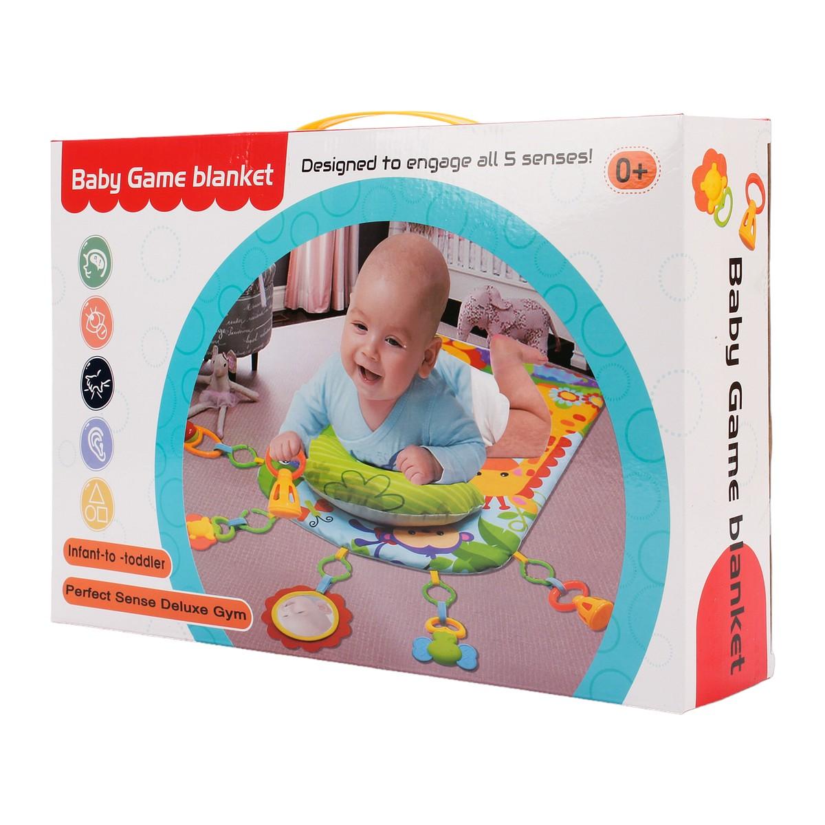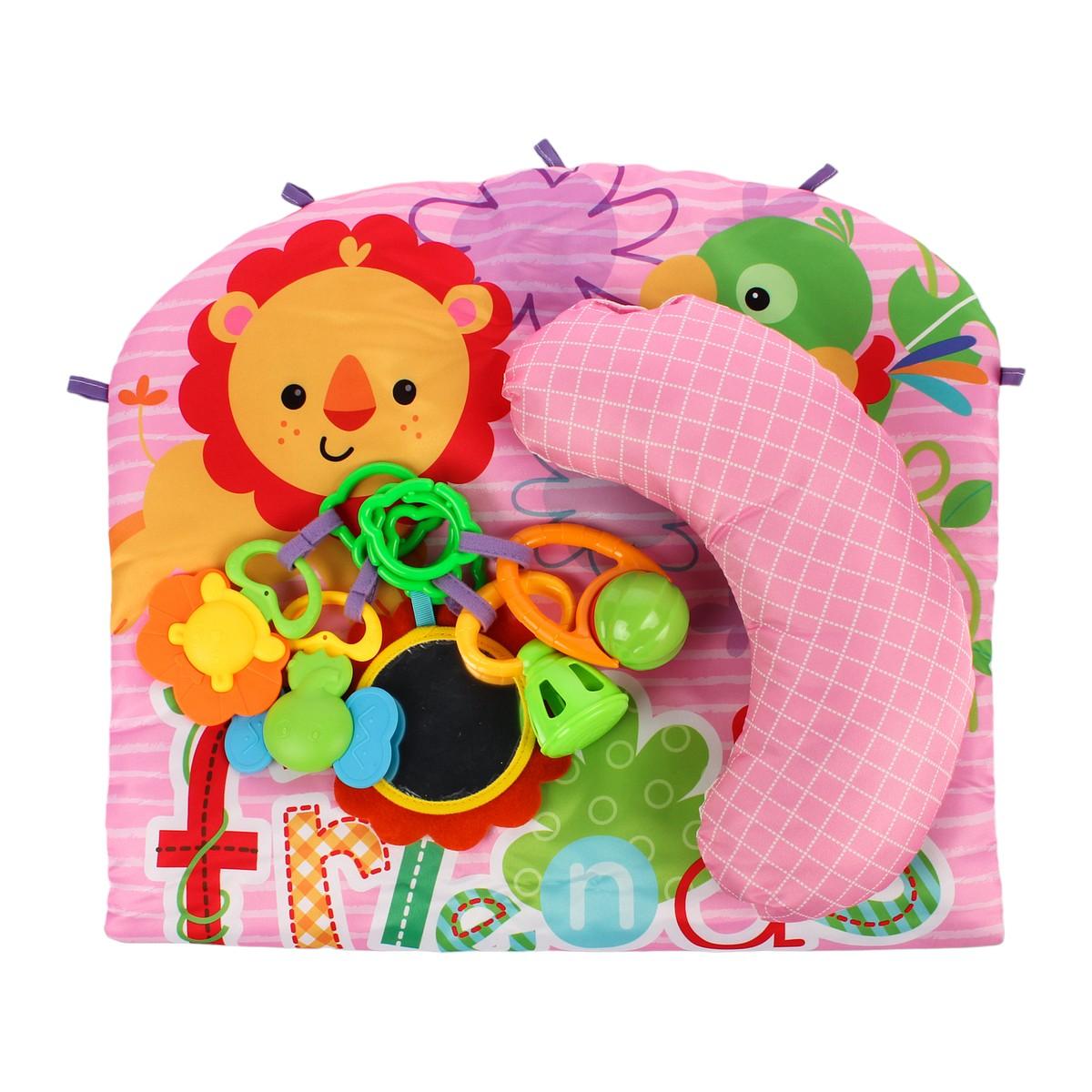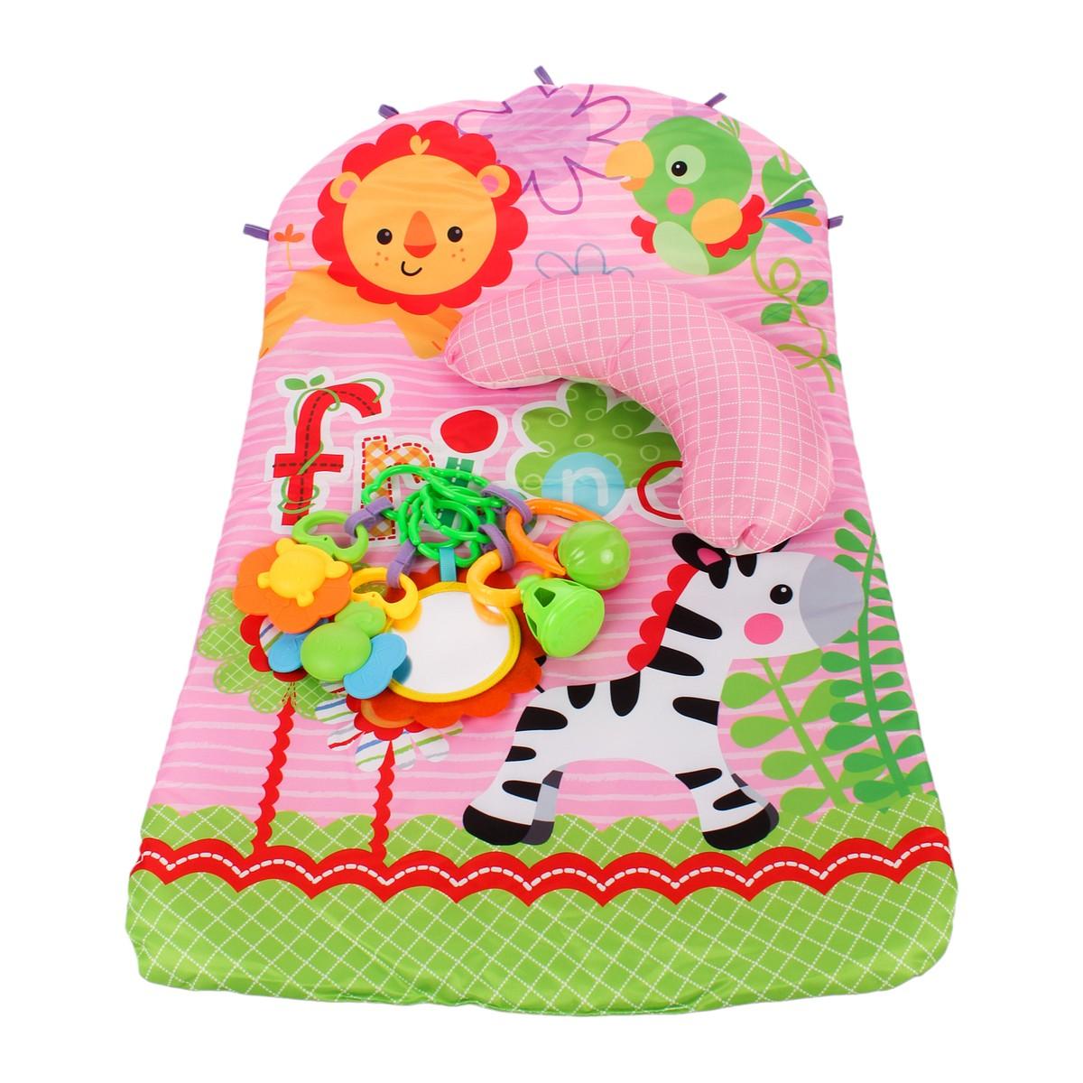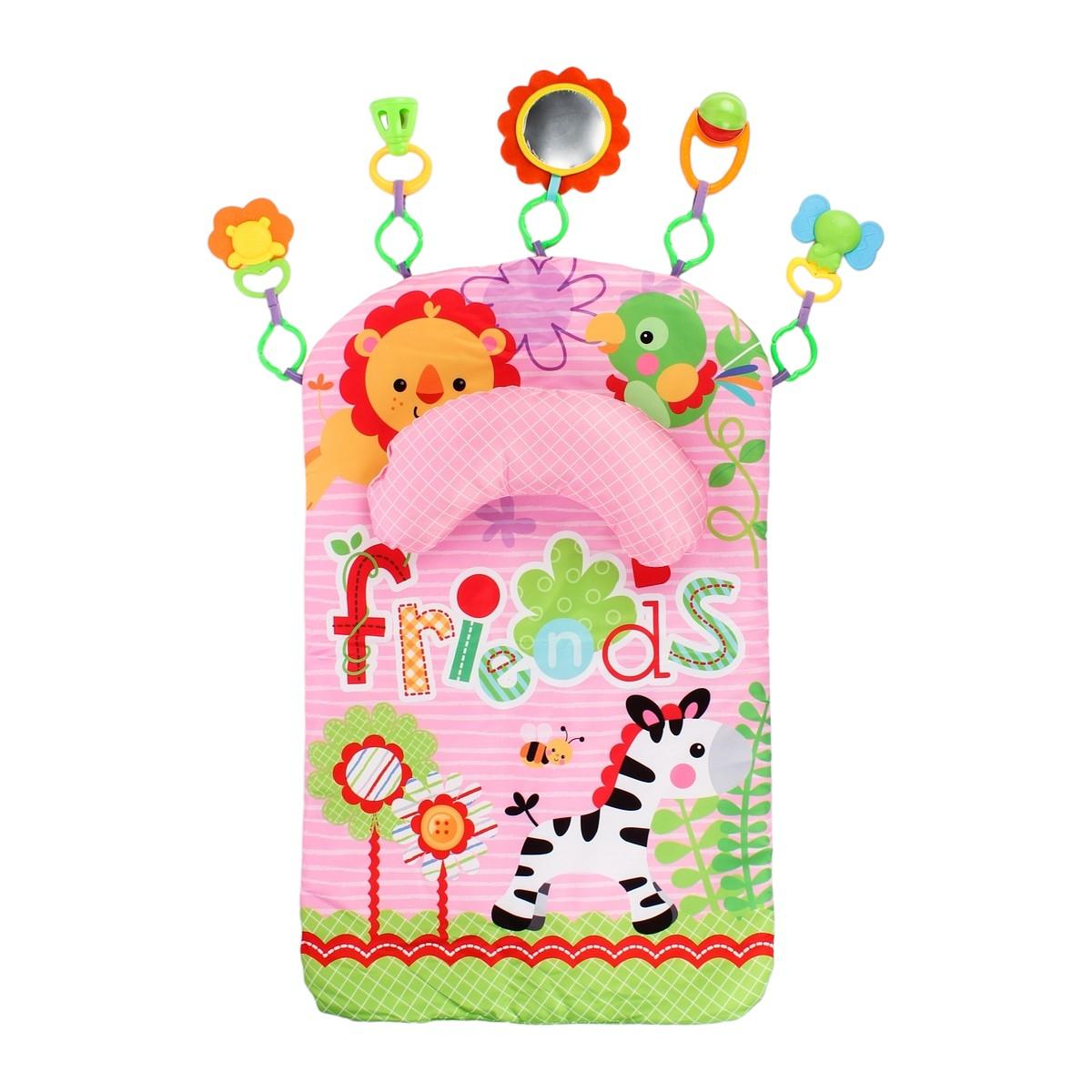 Размер коврика составляет 60х75 см, что делает его достаточно просторным для игры. Упаковка выполнена в картонной коробке размером 38х5х25 см, что удобно для хранения и транспортировки. В комплект входят 5 подвесных игрушек, которые разнообразят игровое время и способствуют развитию моторики.