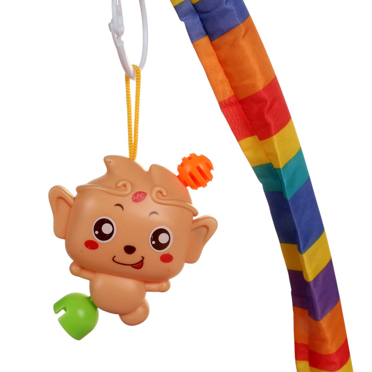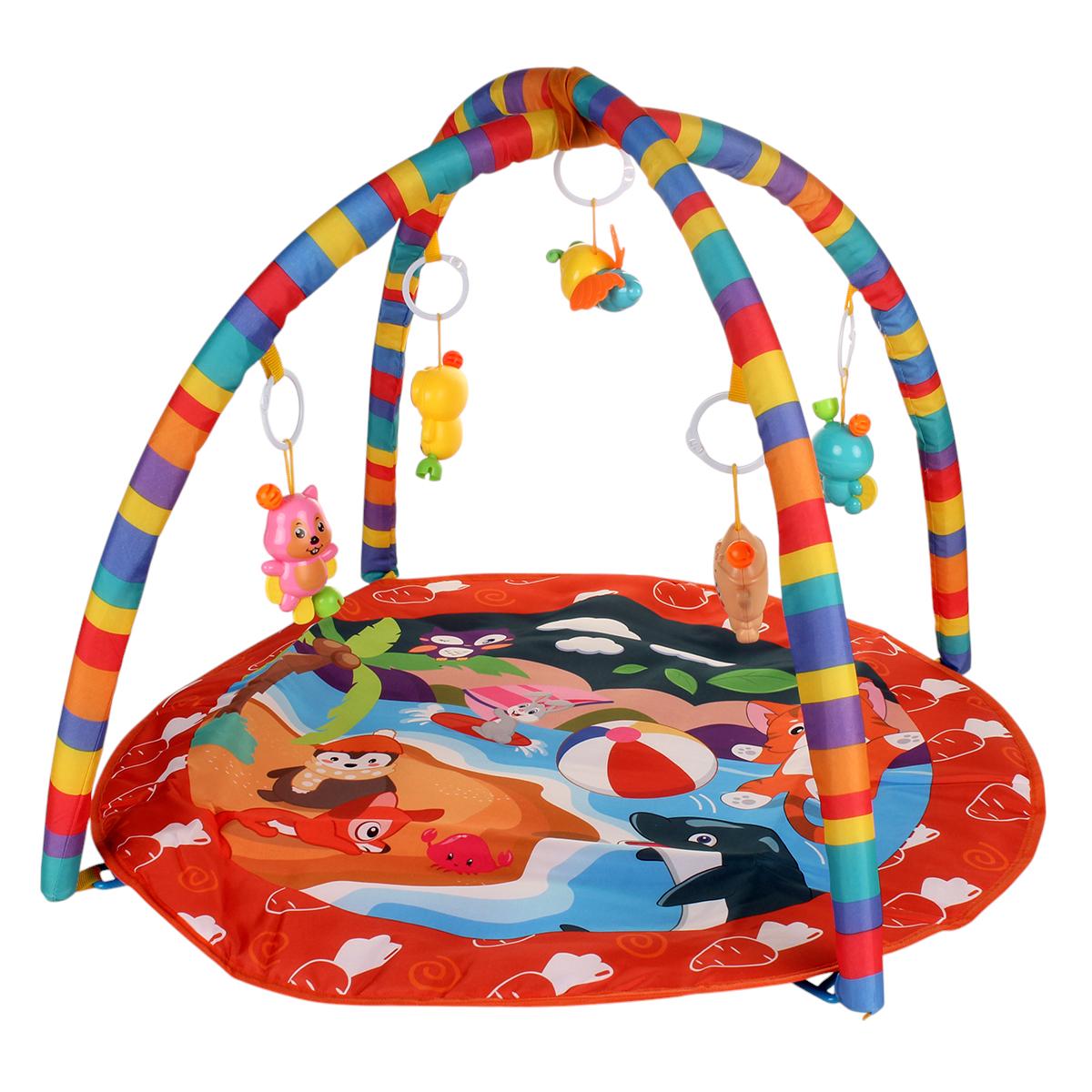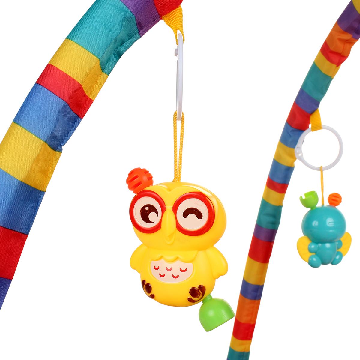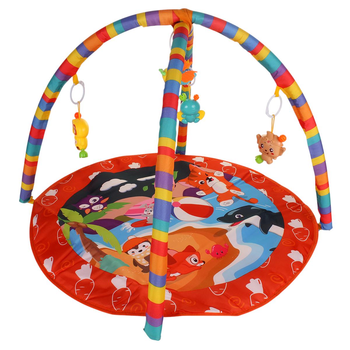 Коврик имеет размеры 72х50 см и оснащен двумя дугами, на которых подвешены игрушки в виде животных и предметов. Это создает увлекательное игровое пространство, где малыш сможет лежать, сидеть и ползать. Коврик подходит для детей с рождения и станет отличным помощником в их развитии.