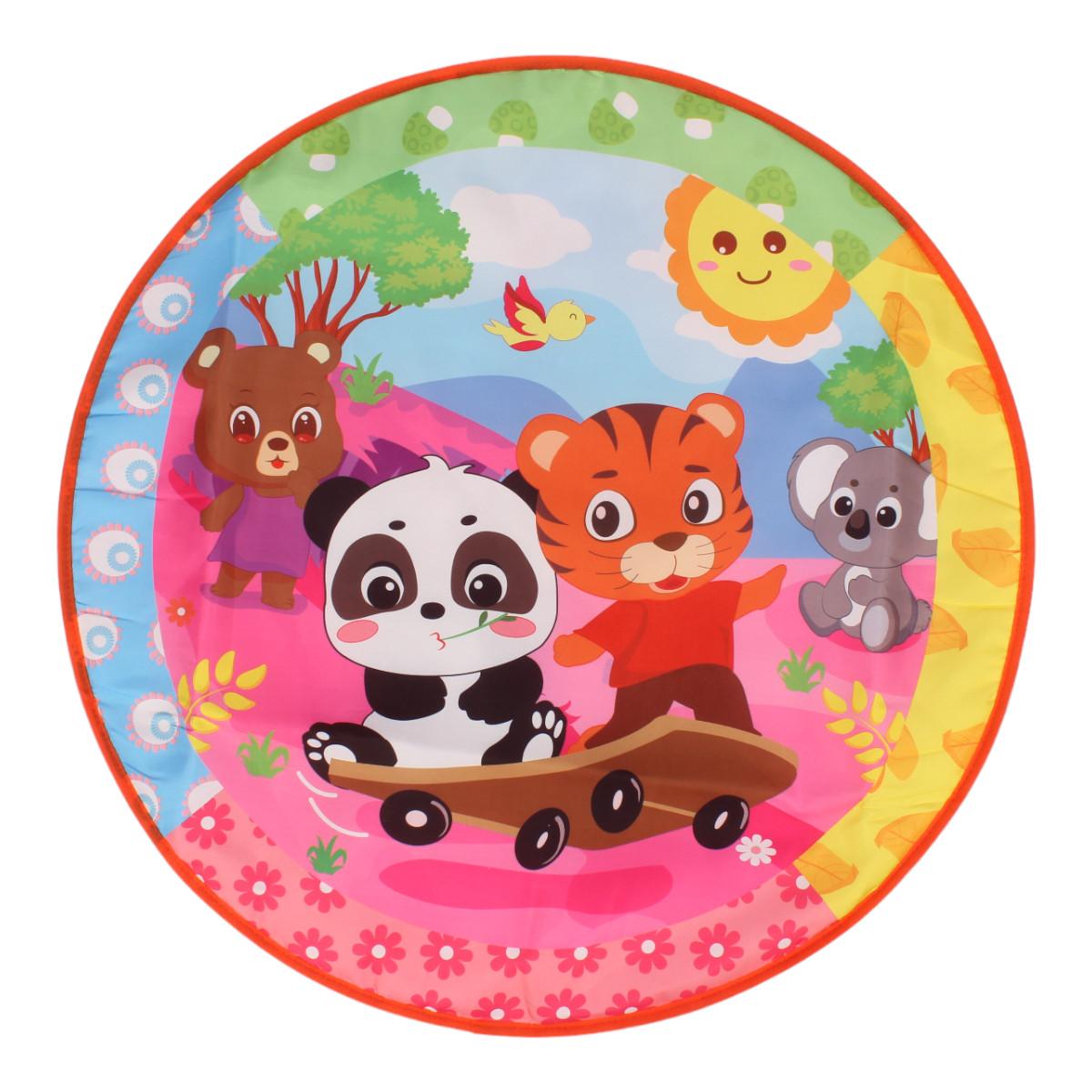 Прочный пластиковый каркас дуг выдерживает активные игры, а мягкий текстильный коврик с тематическим принтом животных создаёт тактильный комфорт. Съёмные элементы позволяют менять конфигурацию игрового пространства по мере роста ребёнка.