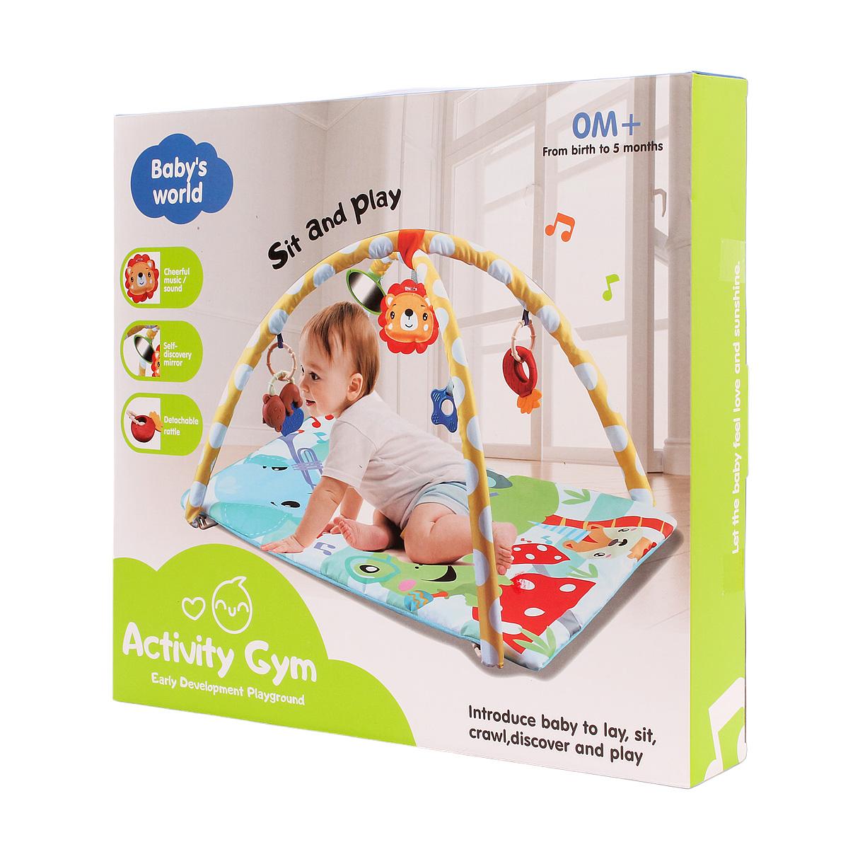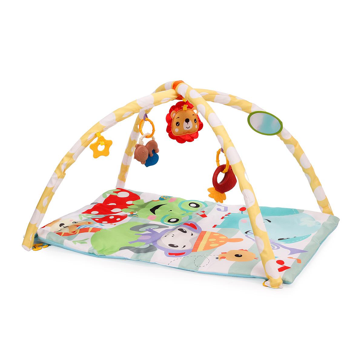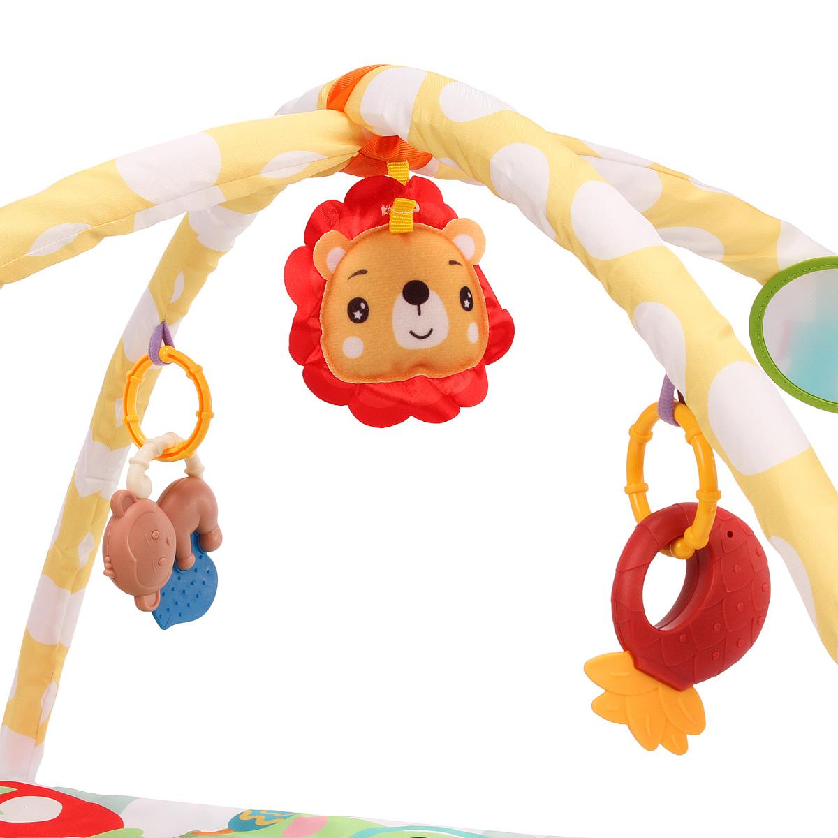 Коврик оснащен двумя поролоновыми дугами высотой 40 см, которые крепятся к коврику с помощью пластиковых деталей. На дугах расположены 5 подвесных игрушек-погремушек, включая мягкую обезьяну и игрушку в виде льва, что делает игру более увлекательной. Коврик подходит для детей от рождения до 5 месяцев, обеспечивая безопасное пространство для лежания, сидения и ползания.