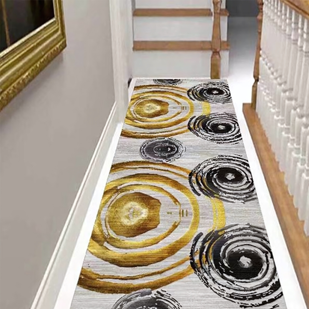 Дорожный коврик из прочного войлочного полотна длиной 15 метров и шириной 0,6 м станет практичным решением для оформления узких коридоров, лестничных пролётов или проходных помещений. Его современный дизайн с серым фоном и абстрактным узором в золотисто-жёлтых, чёрных и белых тонах помогает добавить интерьеру выразительности и уюта.