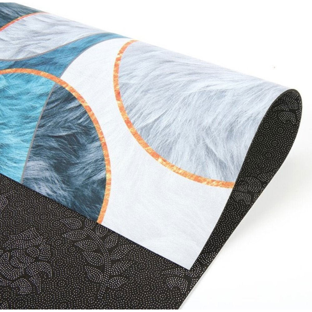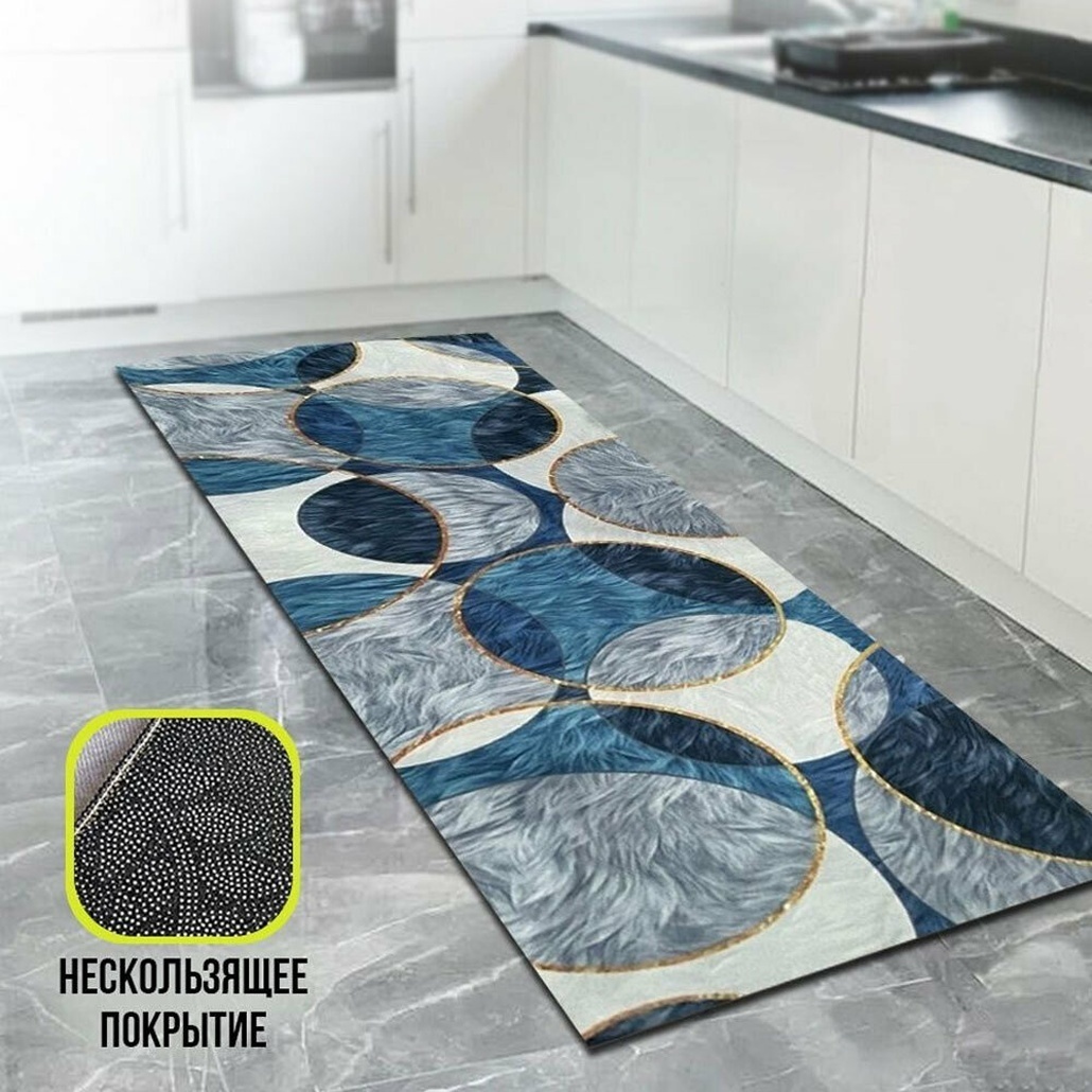 Войлочный коврик рулонный с современным геометрическим дизайном сочетает в себе практичность и эстетичность. Благодаря оригинальной гамме с синими, серыми, белыми и золотыми оттенками он легко вписывается в любой интерьер, придавая ему теплоту и гармонию.