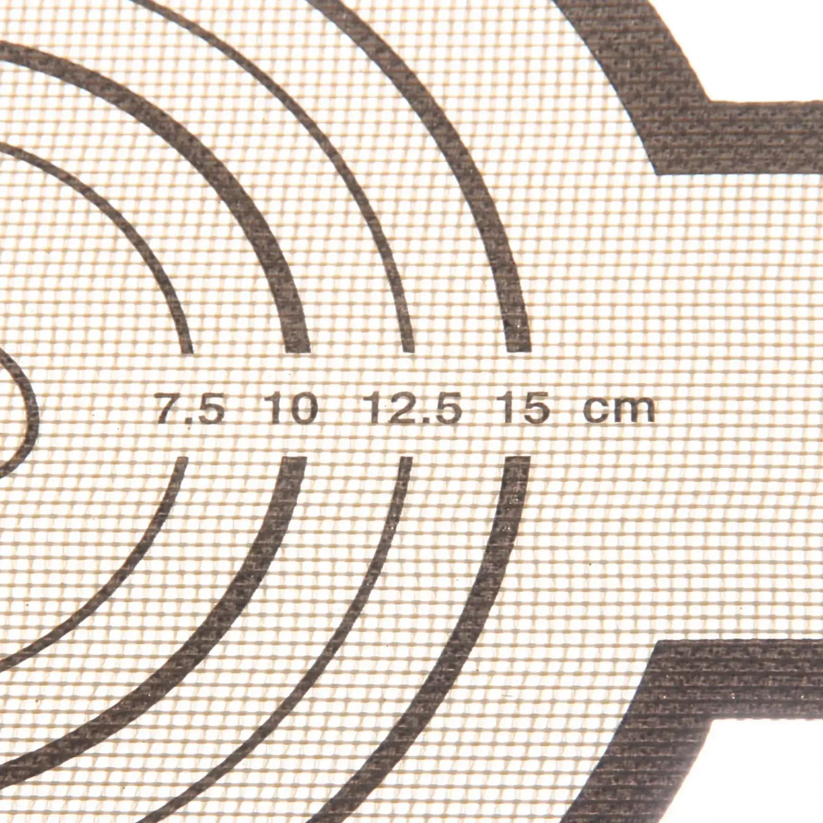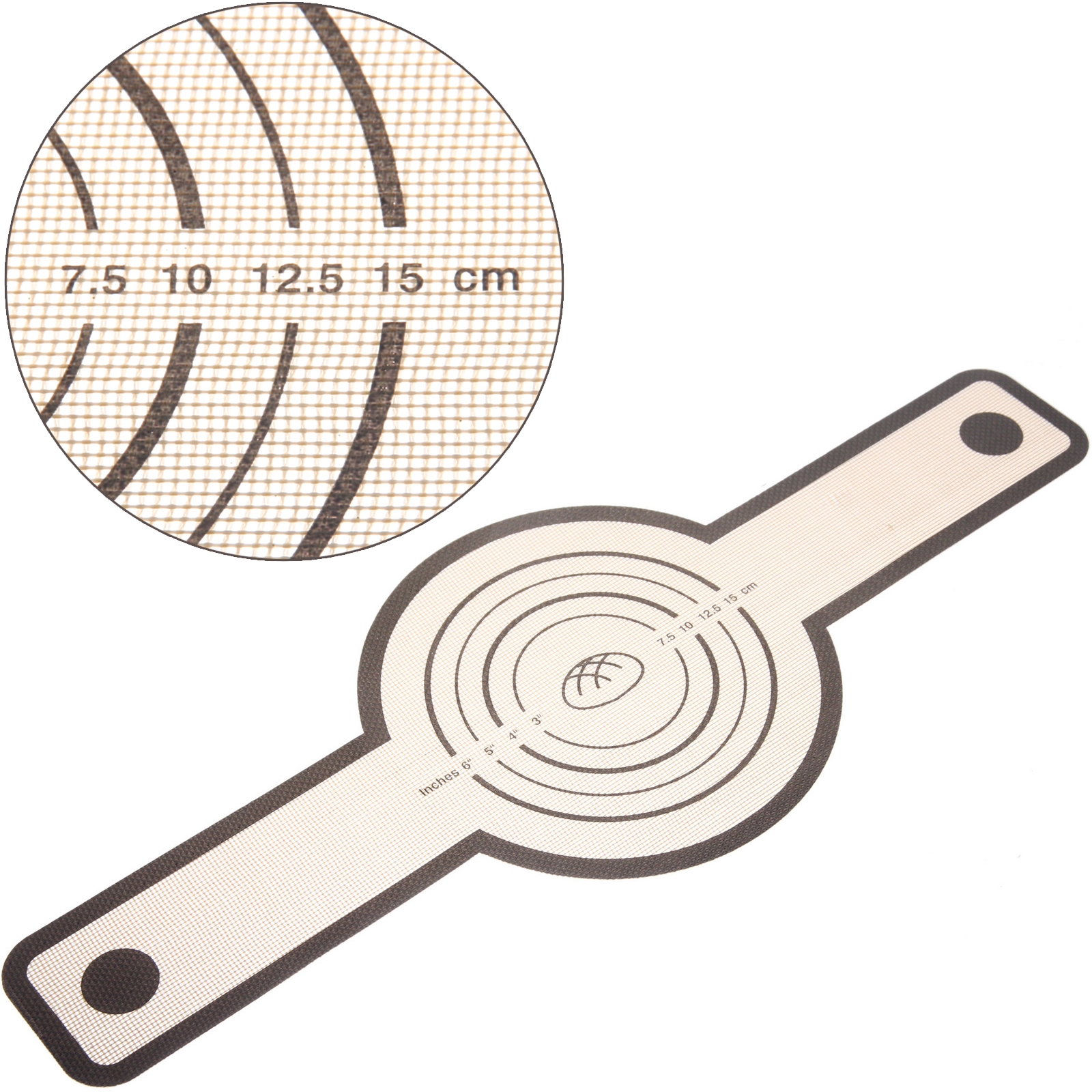 Просто расстелите коврик на рабочей поверхности и приступайте к приготовлению теста. Используйте нанесенные мерные линейки (7.5, 10, 12.5, 15 см) и окружности для точного контроля размеров. Ручки по бокам обеспечивают удобный захват и перенос.
