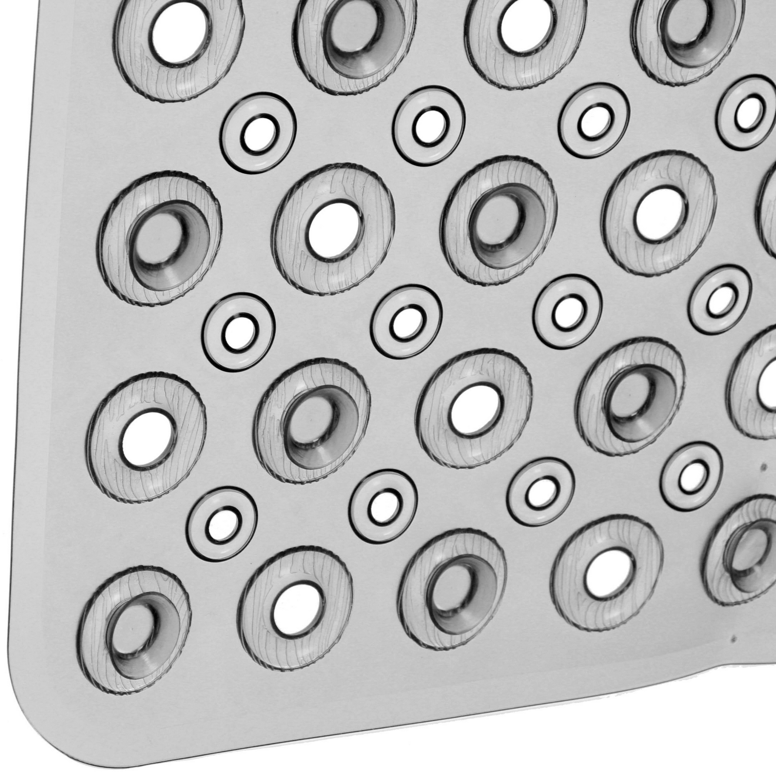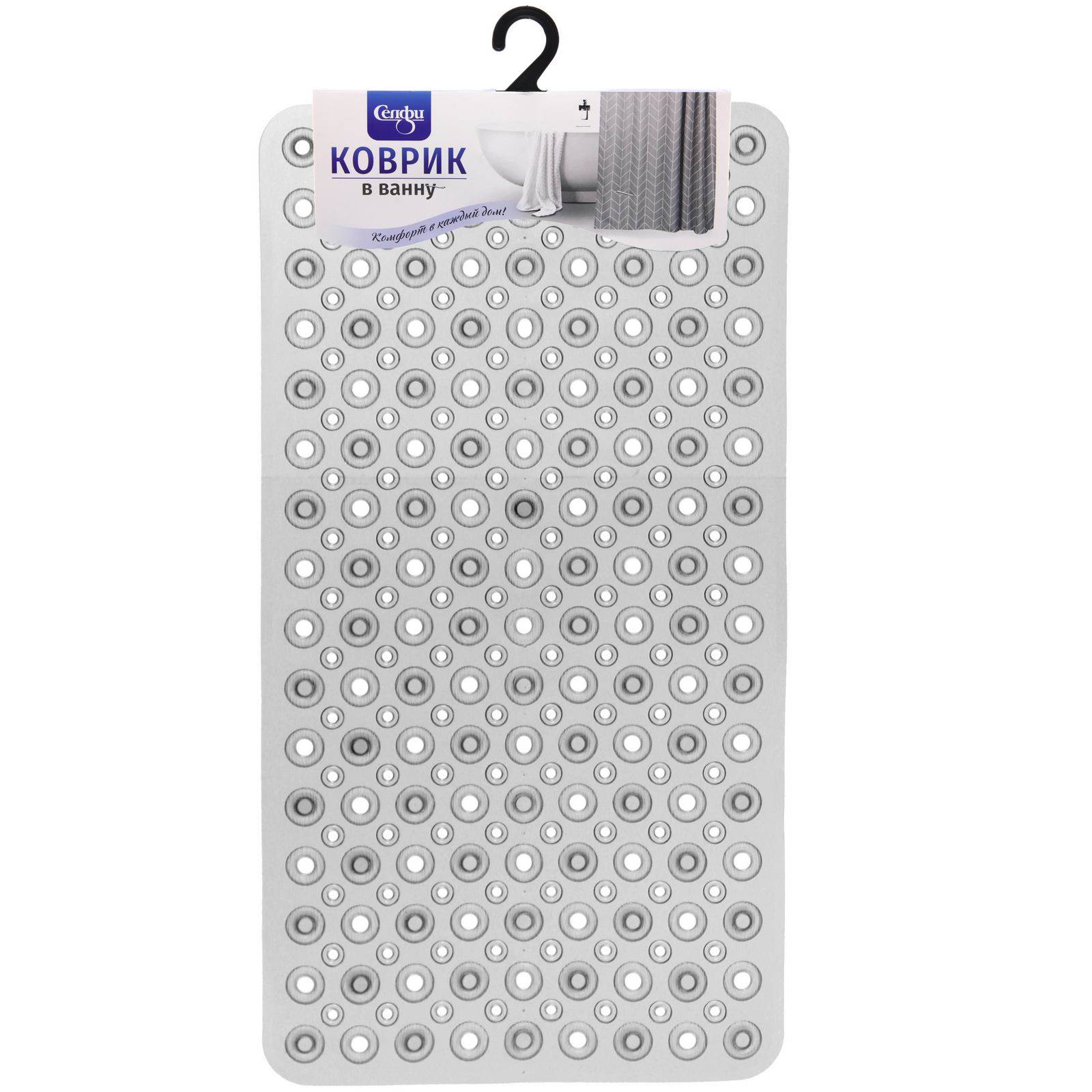 Коврик размером 67х37 см оптимален для стандартных ванн. Серый цвет с рельефным узором маскирует случайные загрязнения, сохраняя эстетичный вид. Встроенный крючок на упаковке позволяет удобно хранить изделие после использования.
