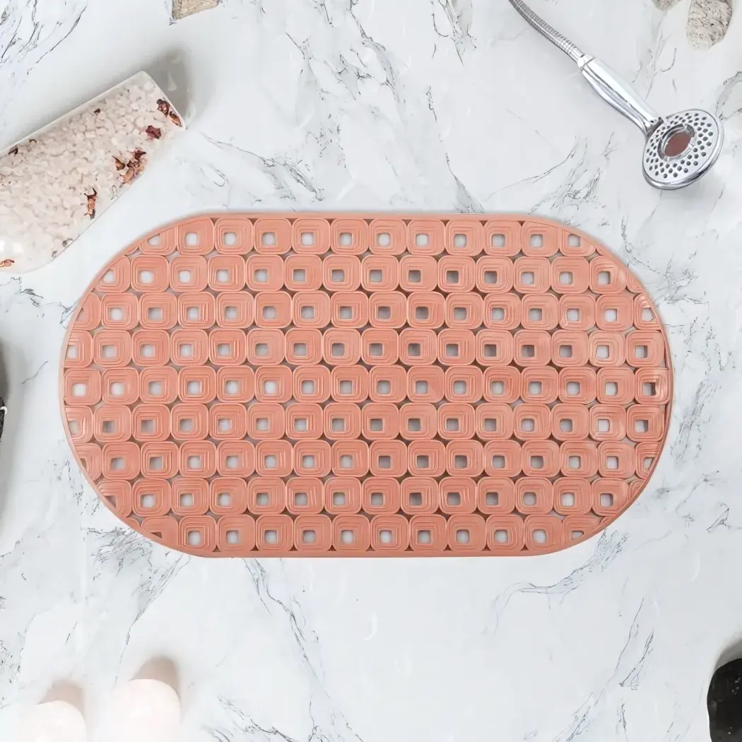 Толщина материала 3 мм обеспечивает долговечность при интенсивной эксплуатации. Размер 70х39 см оптимален для стандартных ванн и душевых кабин. Пастельный розовый цвет гармонично сочетается с белой сантехникой и мраморной отделкой.