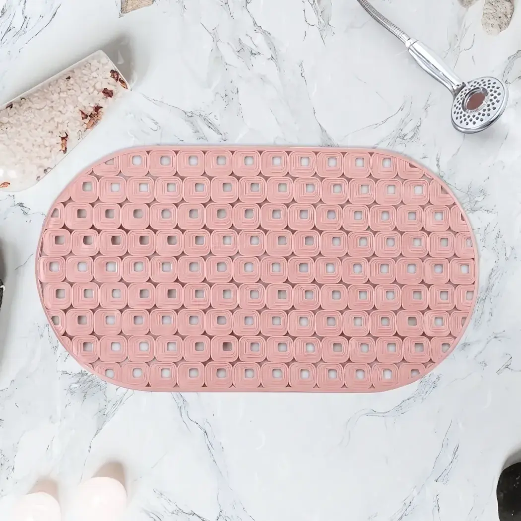 Мягкий противоскользящий коврик с дренажными отверстиями создан для защиты от падений и мгновенного отвода воды. Приятная текстура поверхности массирует ступни, а гипоаллергенный материал ПВХ обеспечивает гигиеничность даже при постоянной влажности.