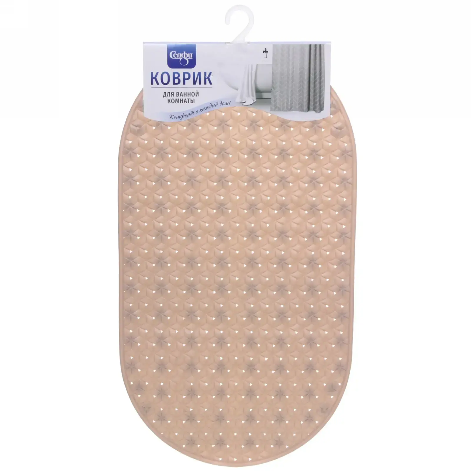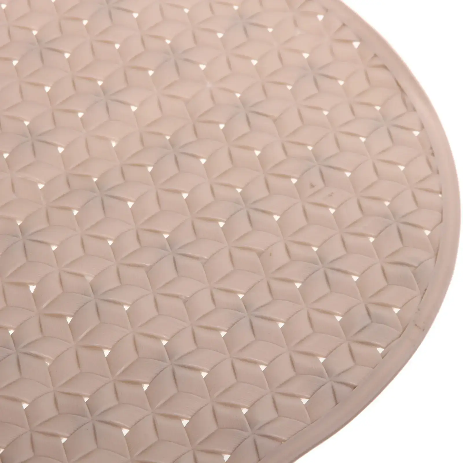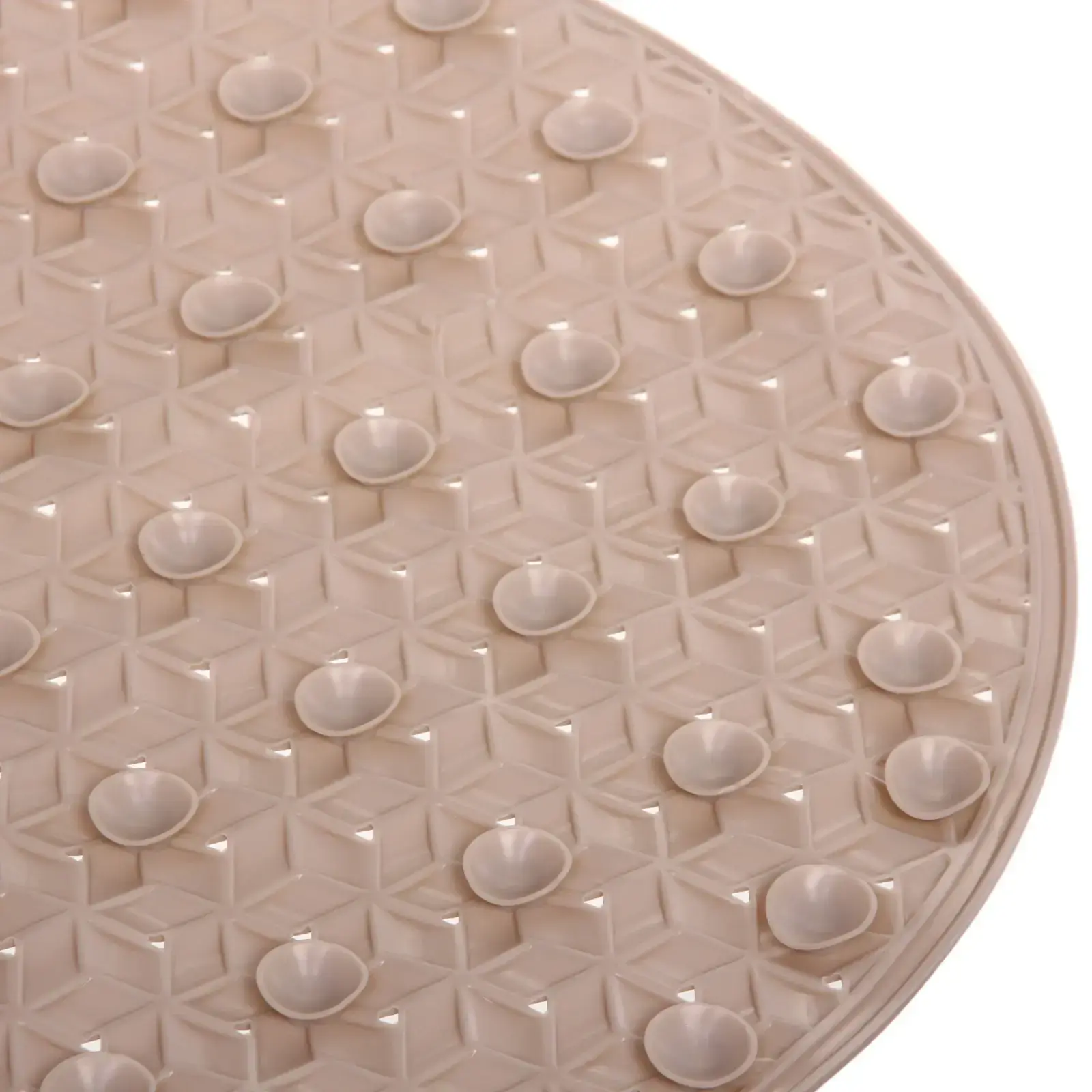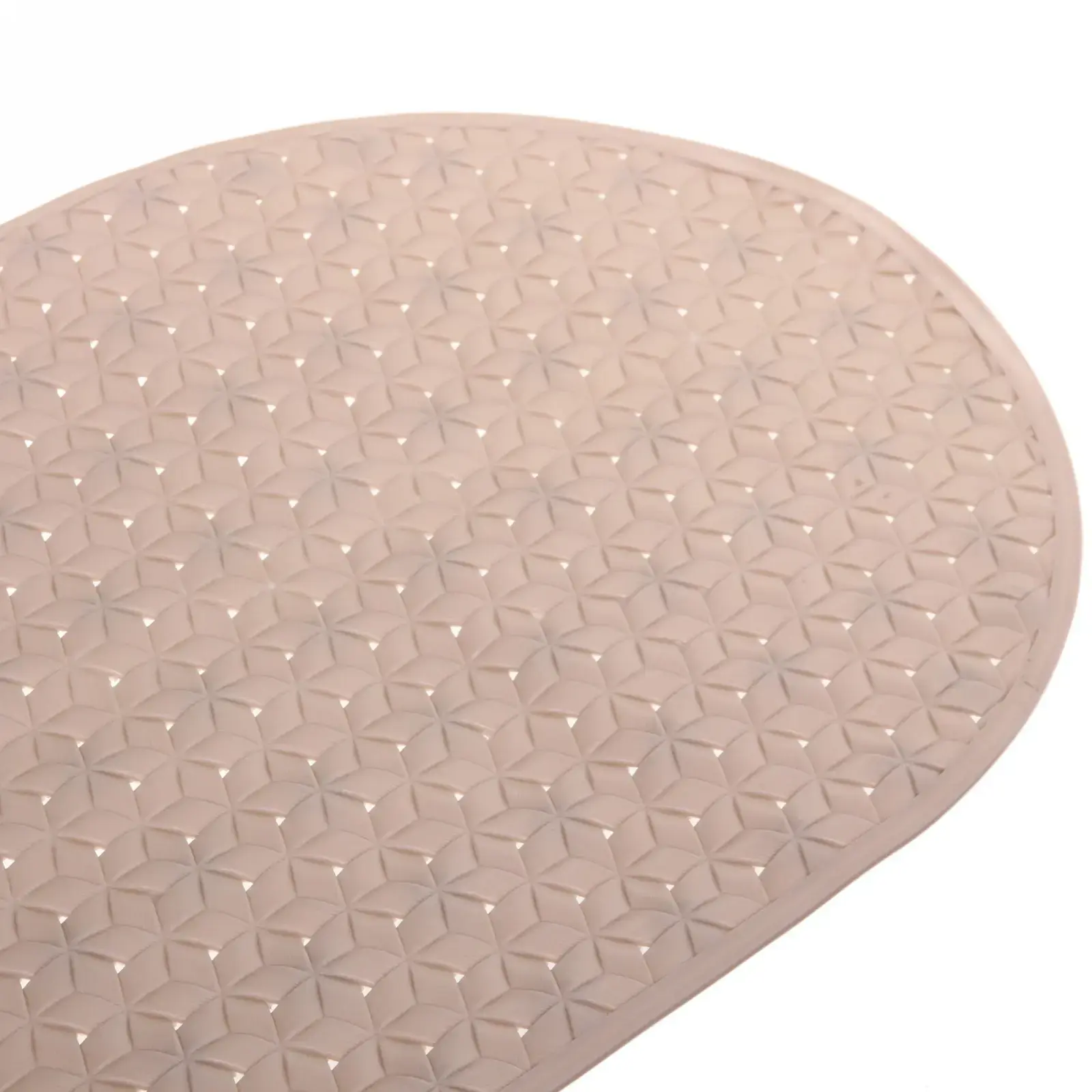 Коврик имеет овальную форму и текстурированный рельефный узор, который не только красив, но и функционален. Он подходит для использования в ванной комнате, на кухне или в других помещениях, где требуется предотвращение скольжения. Благодаря подвесному отверстию, коврик удобно хранить, что добавляет практичности в его использование.