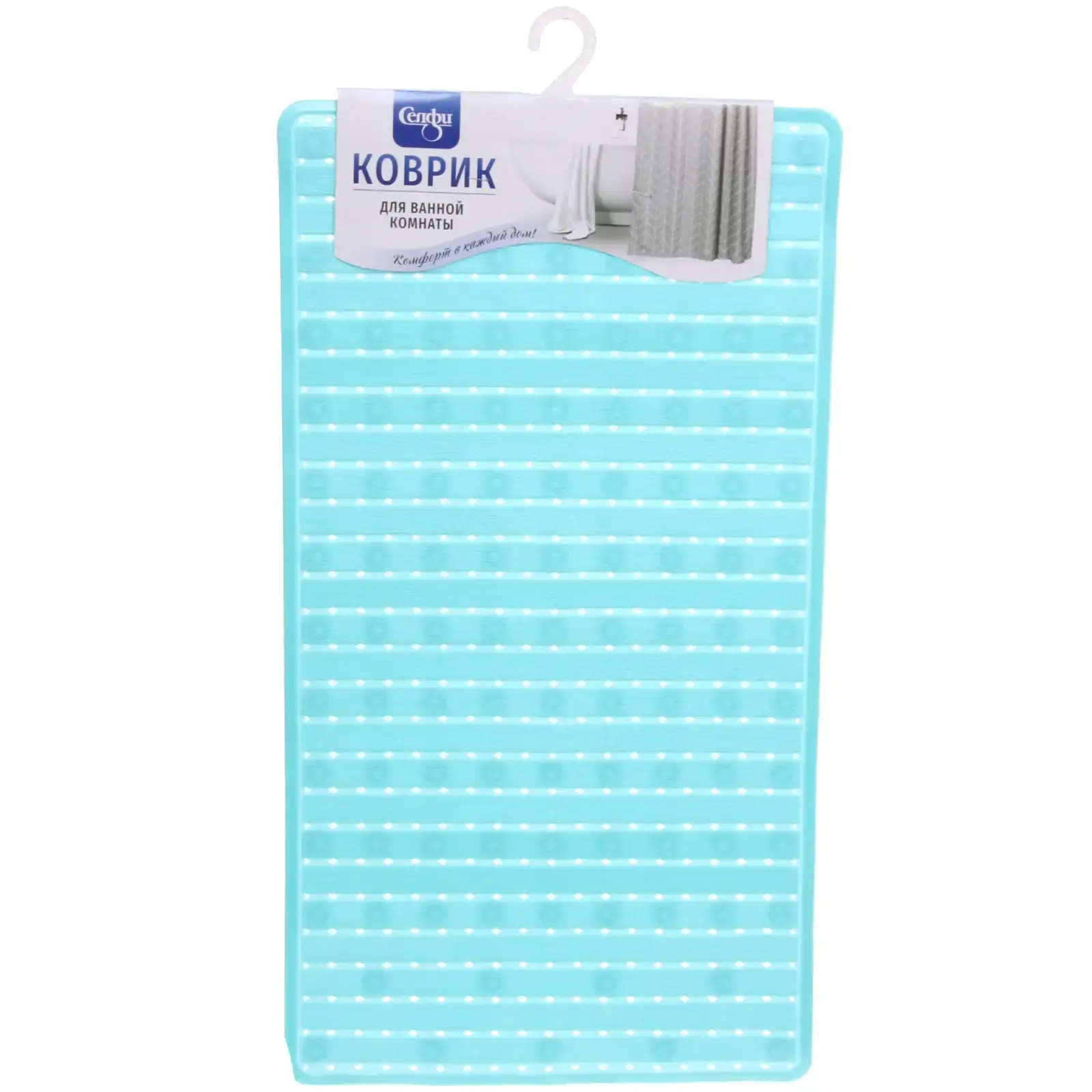 Коврик выполнен в светло-голубом цвете с рельефными полосами и круглыми выпуклостями, что не только красиво, но и функционально. Он подходит для использования в любых условиях, обеспечивая комфорт и безопасность. Не упустите возможность сделать вашу ванную комнату более уютной и стильной с ковриком Селфи!